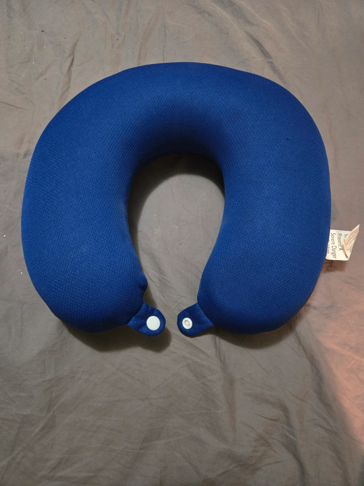 Comfortable neck pillow. Perfect for travel. Soft material. Two small buttons.