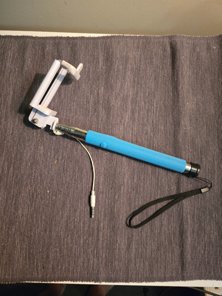 Extendable selfie stick. Features a phone holder and a wired shutter button. Lightweight and portable. Great for travel and photos.