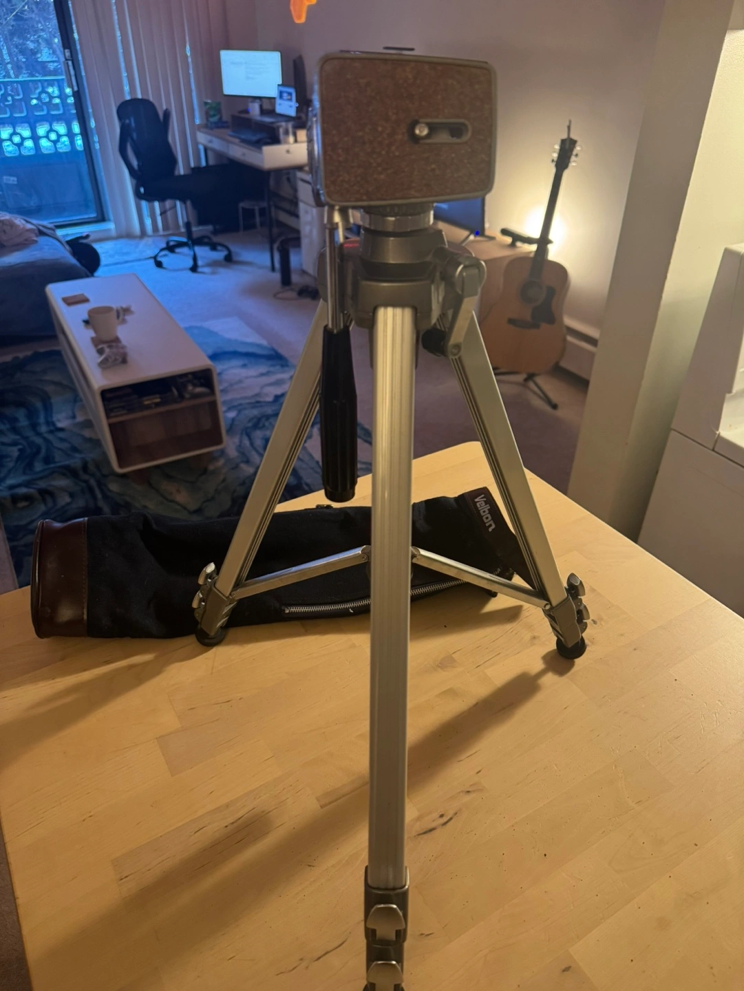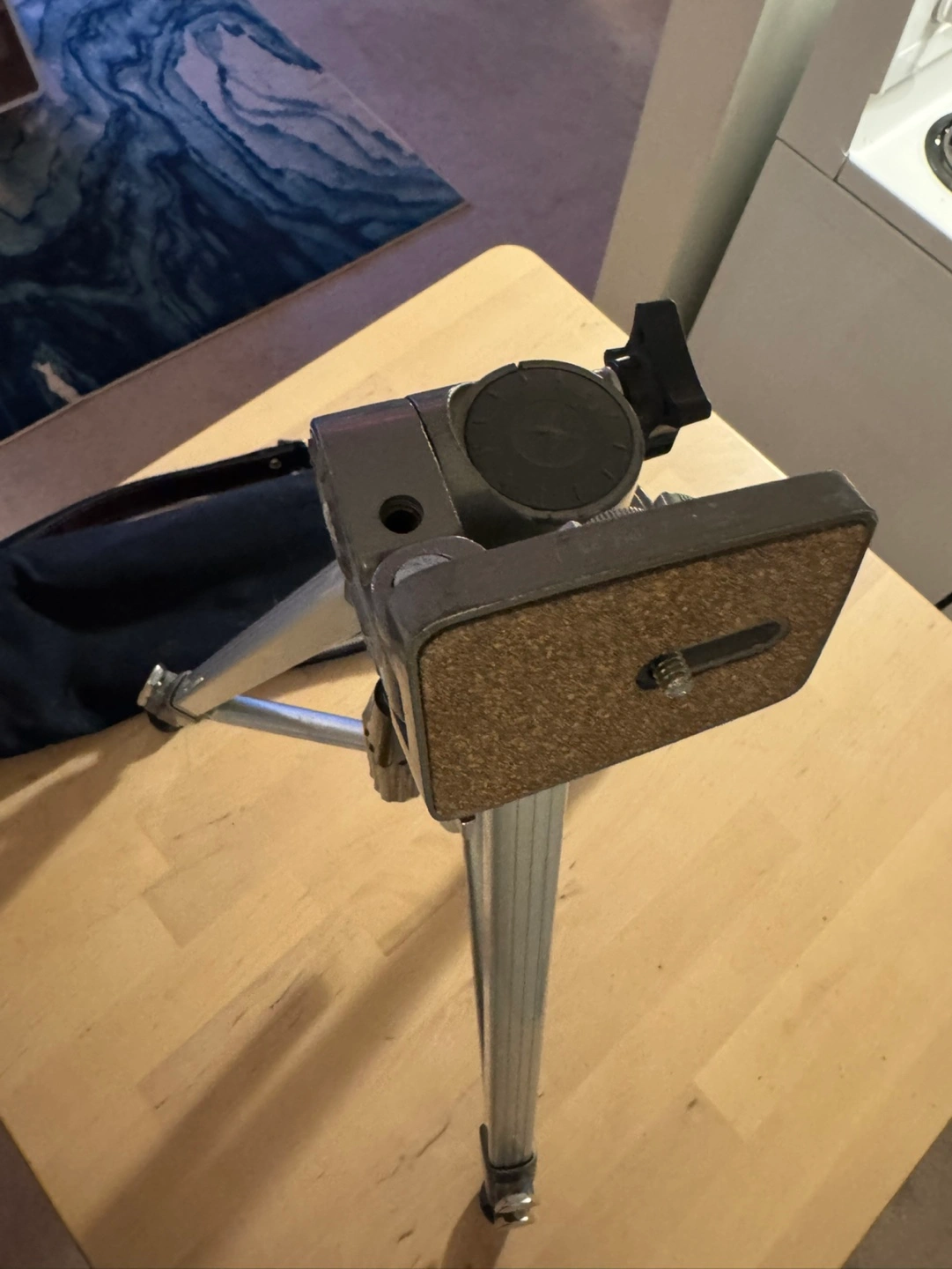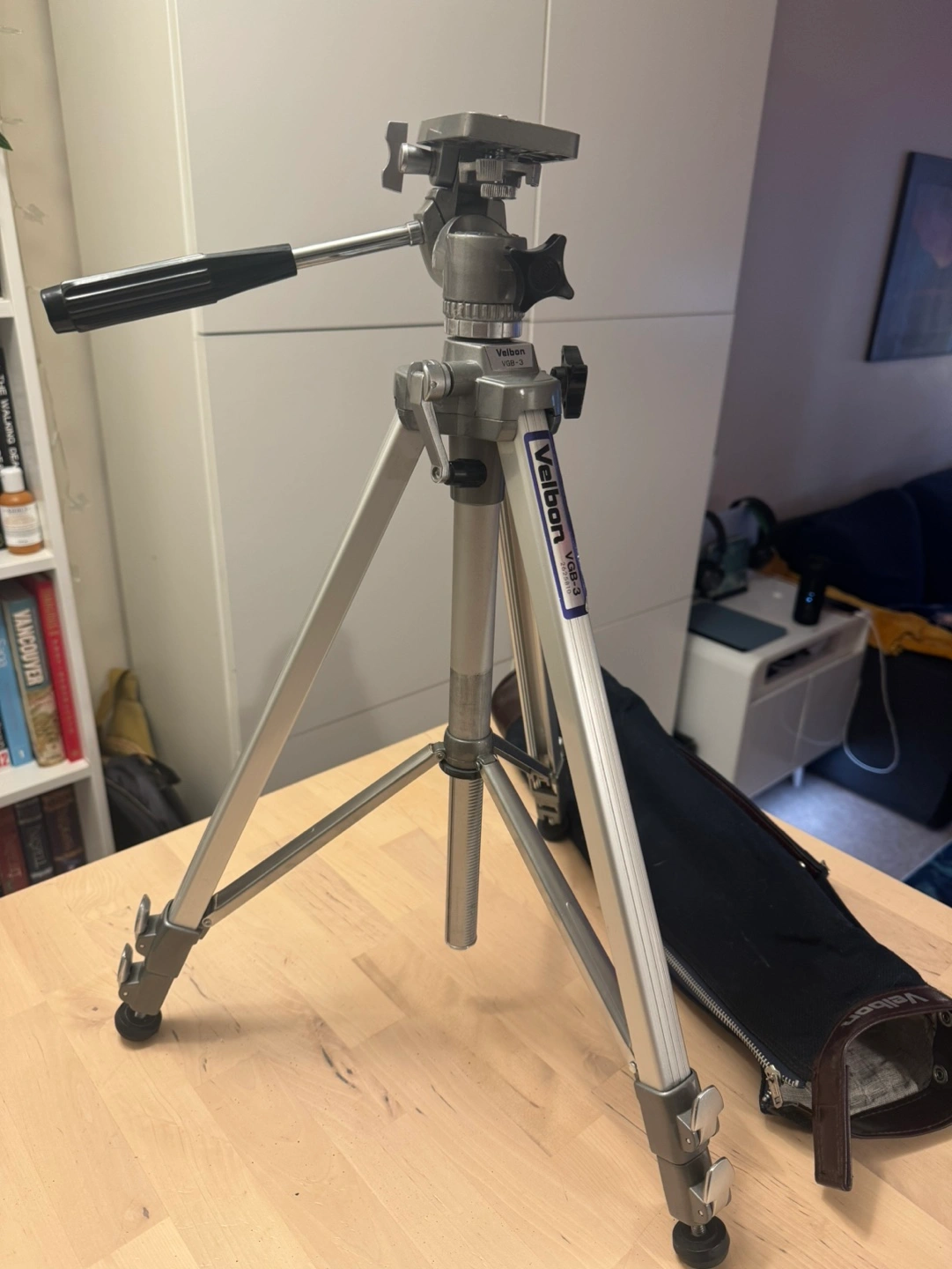 Lightweight aluminium tripod. Features adjustable height and tilt head. Includes a carrying case. Great for photography or videography.