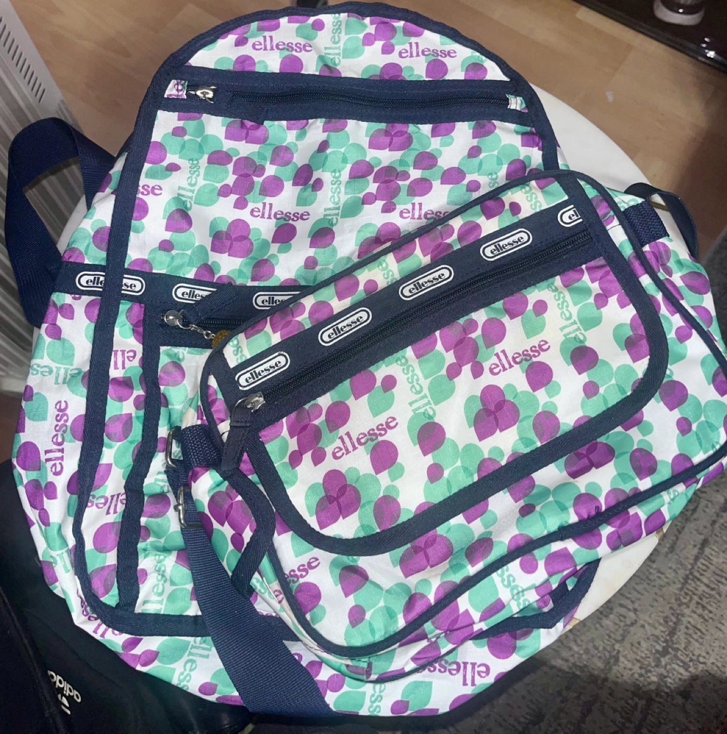 Vintage ellesse backpack and shoulder bag set. Purple, teal, and white pattern. Multiple pockets. Great for everyday use or travel.