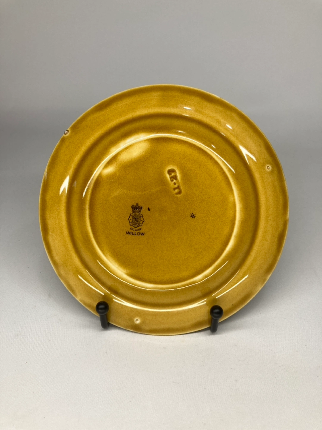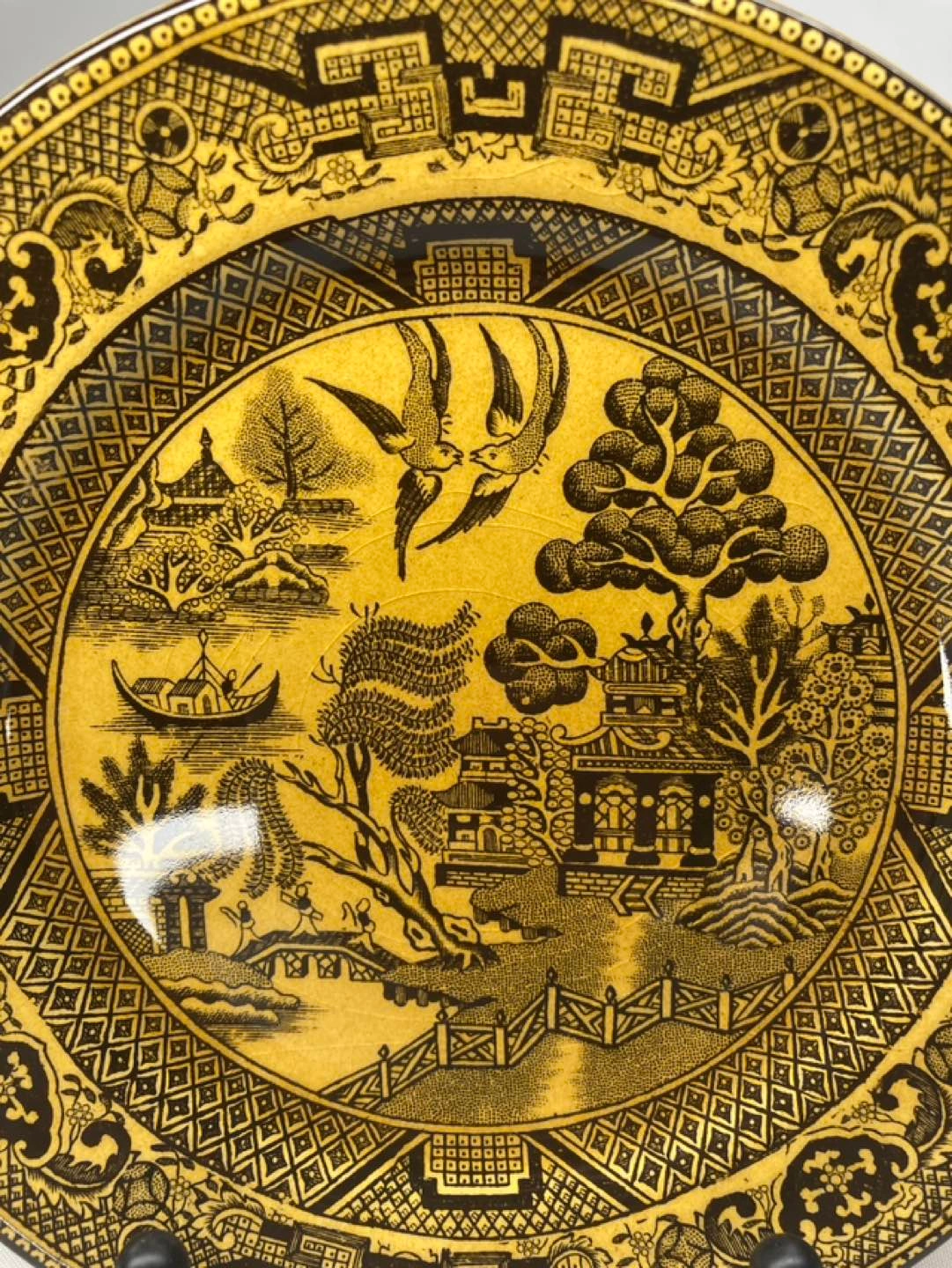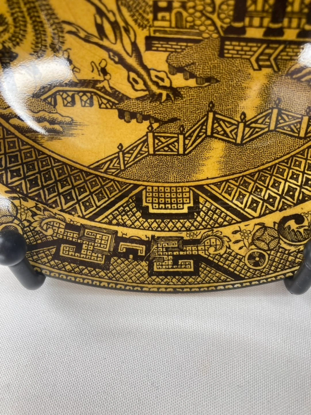 Exquisite Asian inspired pattern on this Doulton Burslem piece. Only made between 1885-1902 by the company we now know as Royal Doulton. For display or use this looks amazing either way. In the much rarer mustard colour these do not come up often. The design detail is as vibrant as the day it was made. Well marked and stamped with pattern number. All-over crazing as one would expect, but no chips or cracks. There are a few spots on the back that were manufacturing inclusions that do not affect the item. ~6.5” across and ~.75” deep.