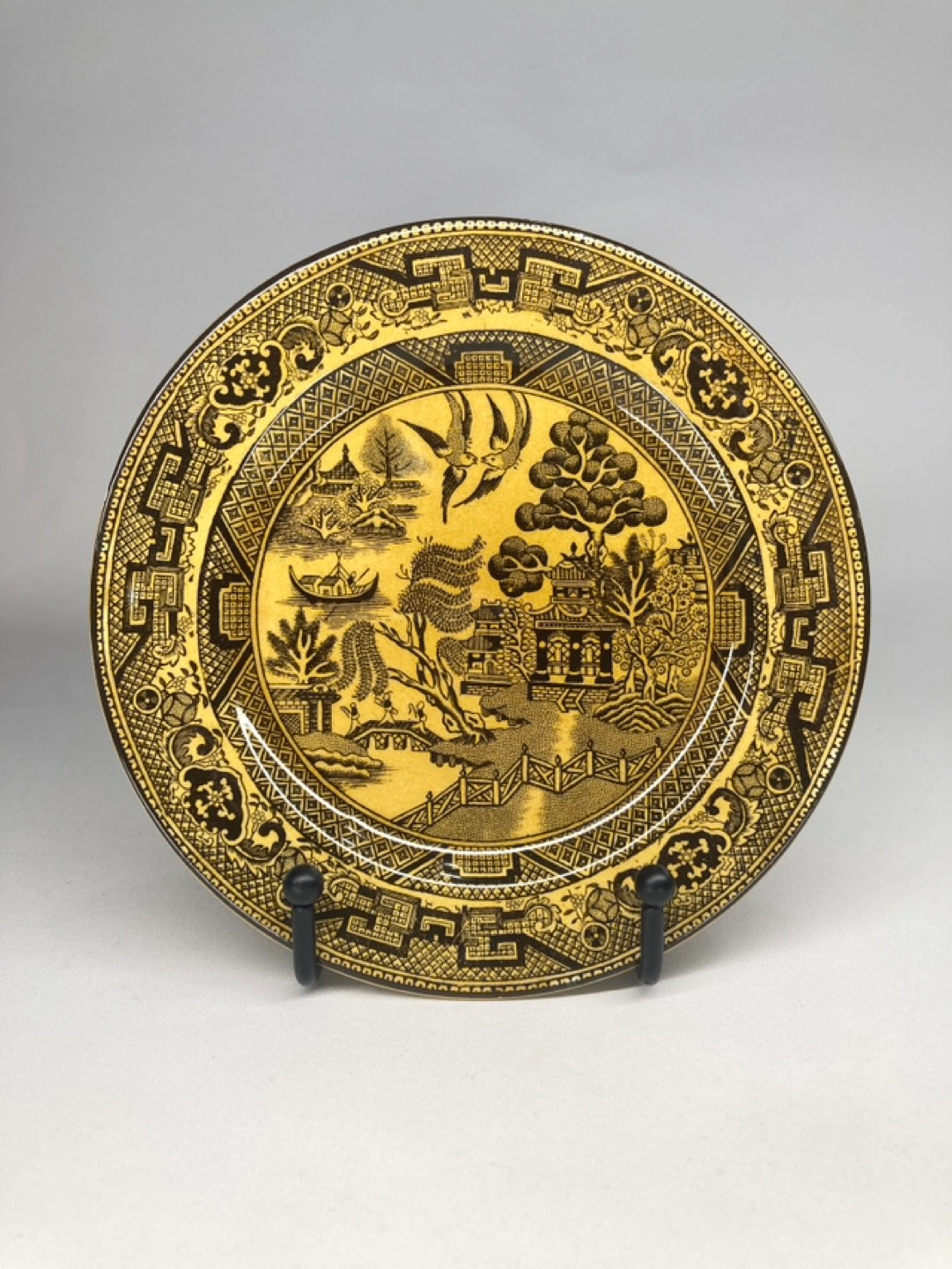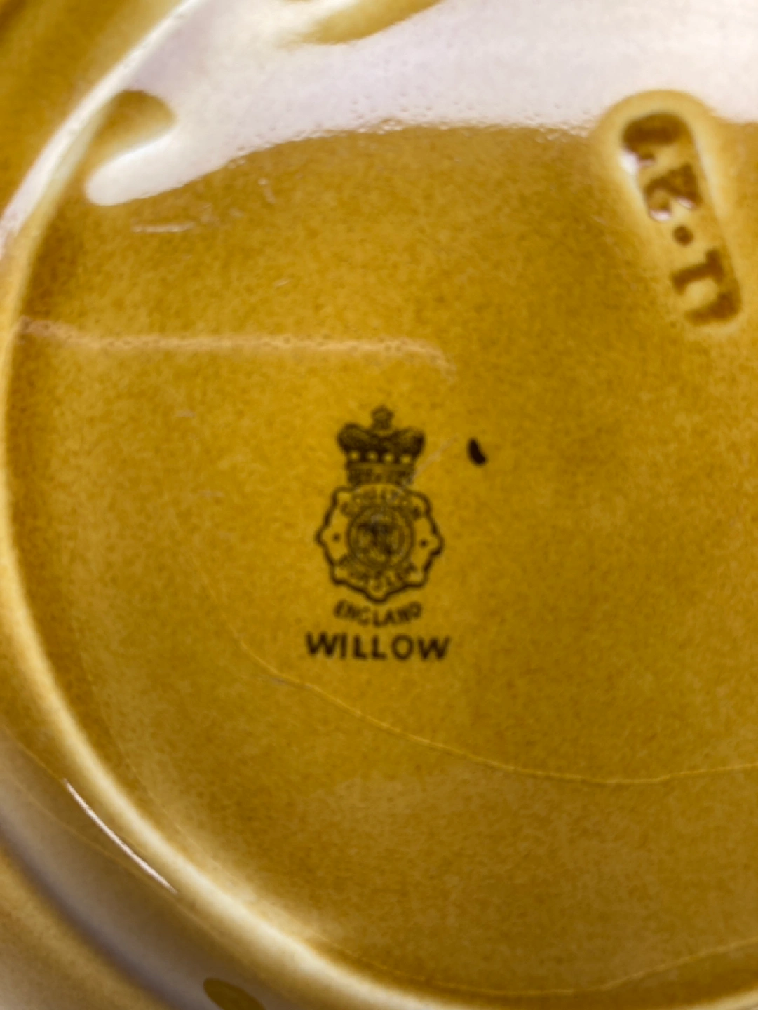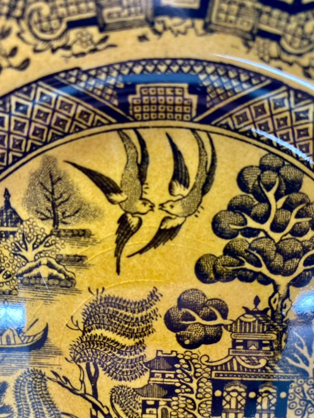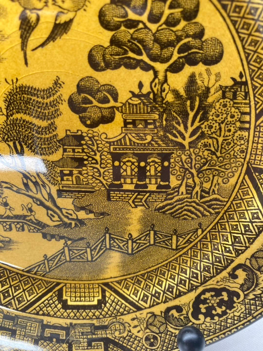 Exquisite Asian inspired pattern on this Doulton Burslem piece. Only made between 1885-1902 by the company we now know as Royal Doulton. For display or use this looks amazing either way. In the much rarer mustard colour these do not come up often. The design detail is as vibrant as the day it was made. Well marked and stamped with pattern number. All-over crazing as one would expect, but no chips or cracks. There are a few spots on the back that were manufacturing inclusions that do not affect the item. ~6.5” across and ~.75” deep.