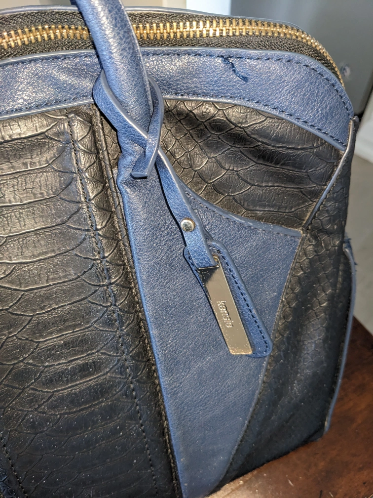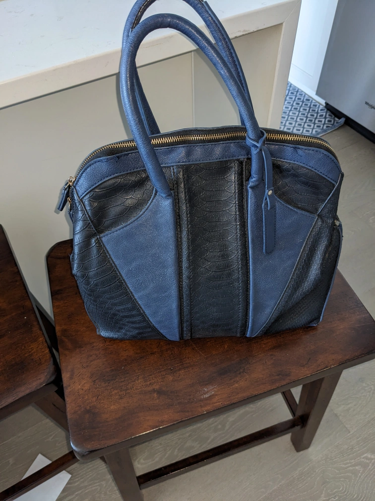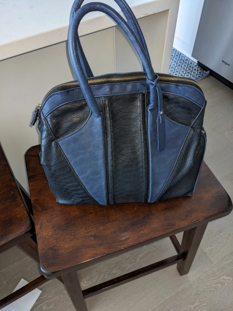Stylish two-toned handbag. Black and navy blue. Gold zipper. Double handles. Snakeskin pattern on one side. Excellent for everyday use. Smoke and pet-free home