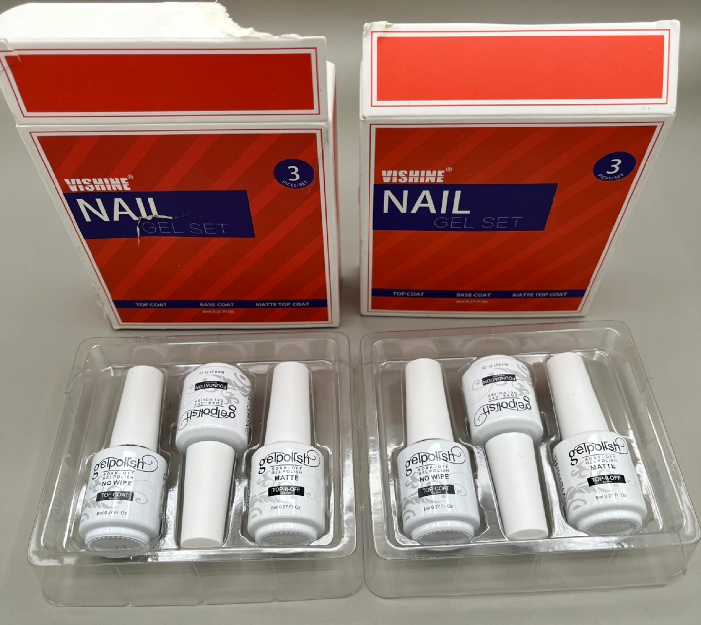Two new, unopened Vishine nail gel sets. Each set includes a top coat, base coat, and matte top coat. 8ml bottles. $10 each or both $15