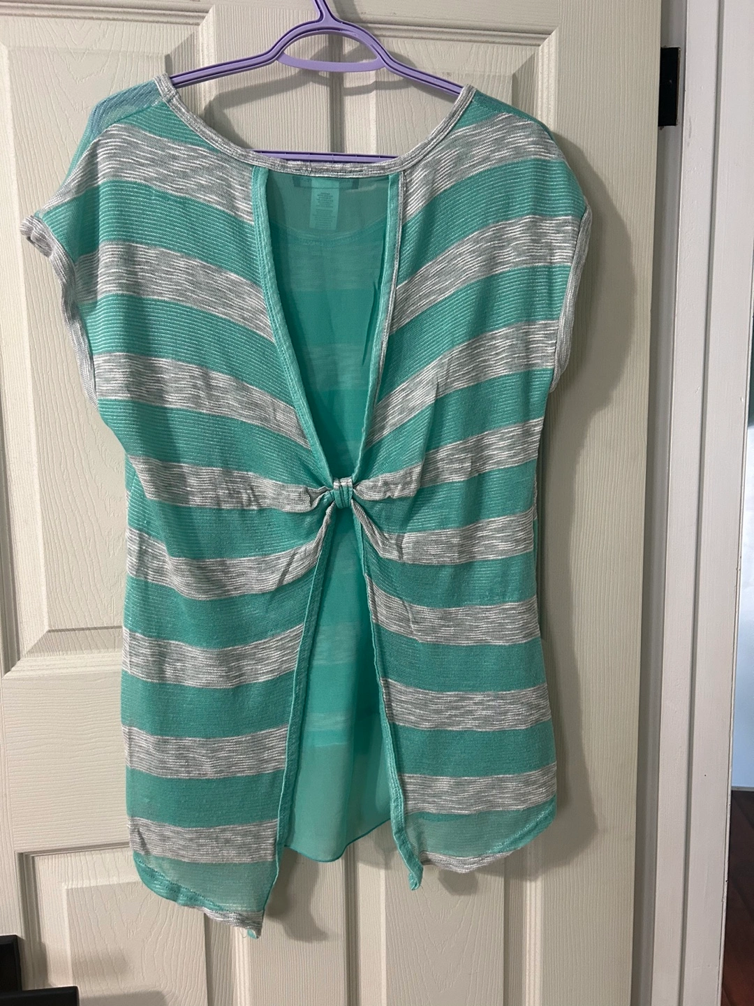 Women's size large. Teal and grey striped top. Sheer back detail with a tie. Short sleeves. Lightweight material. Sheer fabric at the back. I would love to make a bundle deal, please view my other listings.