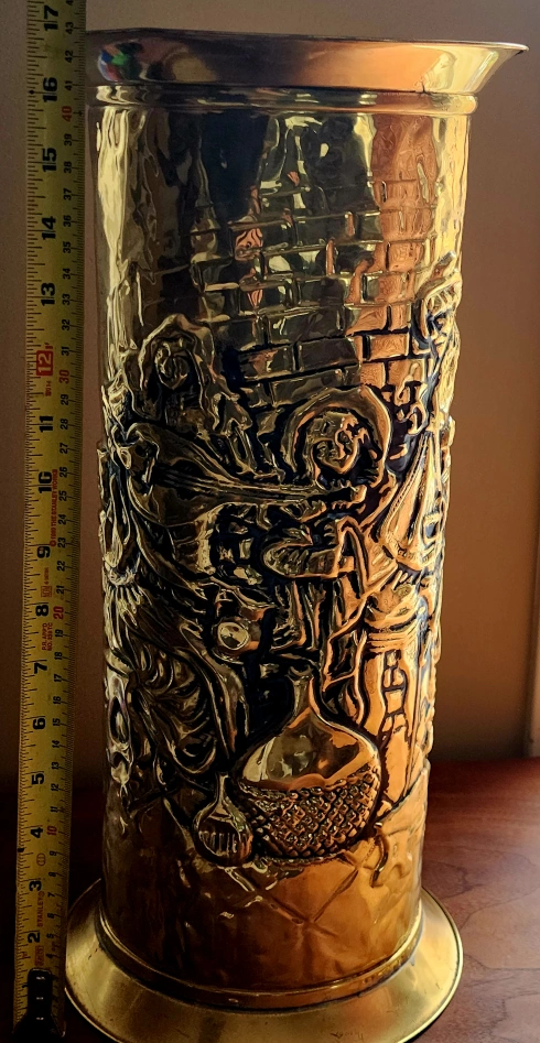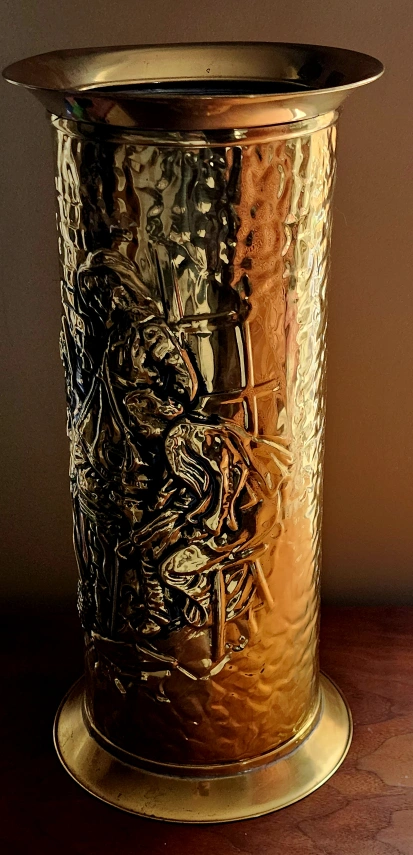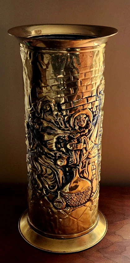Tall brass umbrella stand. Embossed with a detailed scene. Features a wide top opening and a stable circular base. Unique and decorative piece.