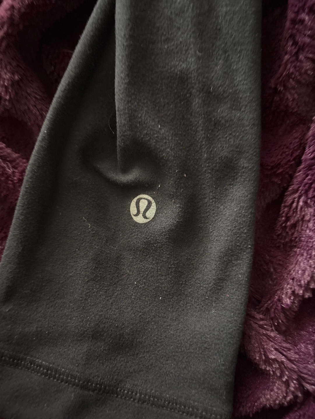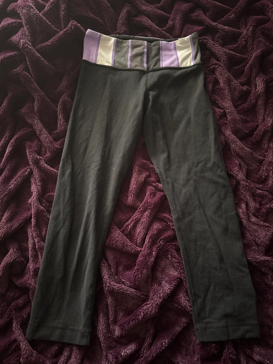 Lululemon black Luon cropped leggings. Size 2. Purple, grey and white waistband detail. Excellent pre-owned condition.