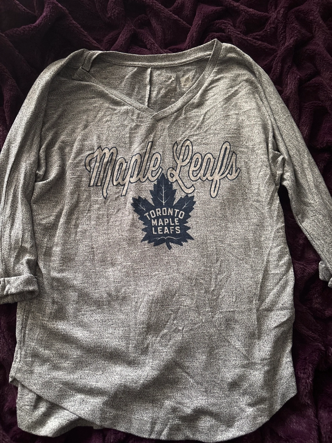 Grey heather long sleeve shirt. Features Toronto Maple Leafs logo and lettering. V-neck.