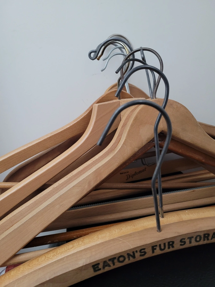 Lot of wooden hangers. Various styles and brands. Includes Eaton's Fur Storage and Diplomat hangers. $1 each or all for $10