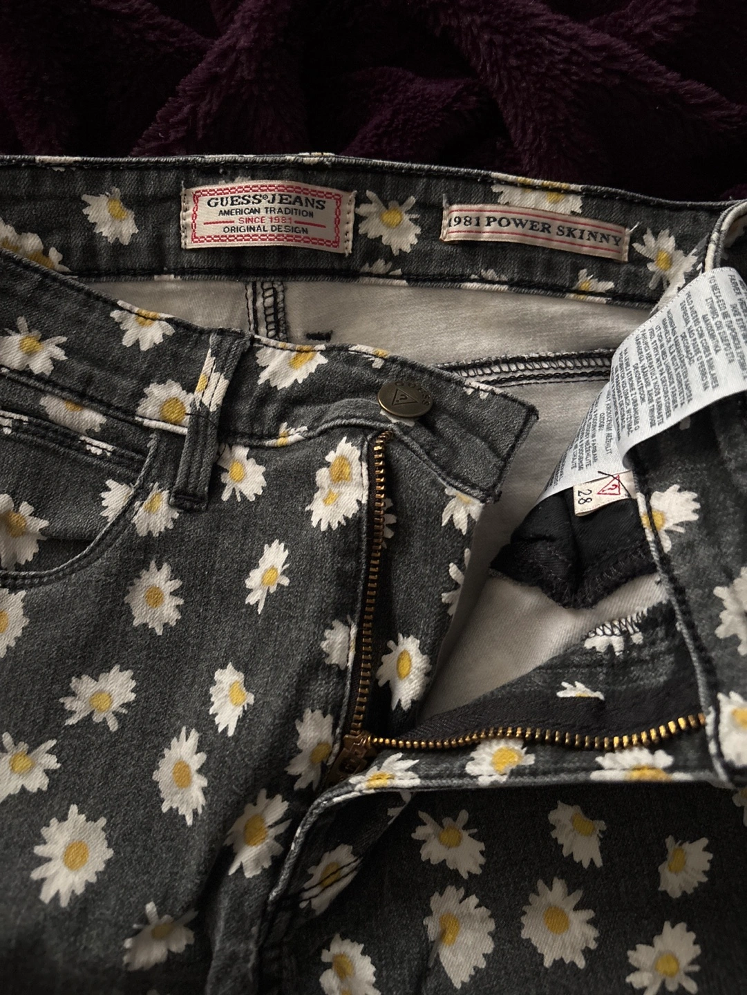 Dark grey skinny jeans. All-over daisy print. Size 28. Excellent condition.