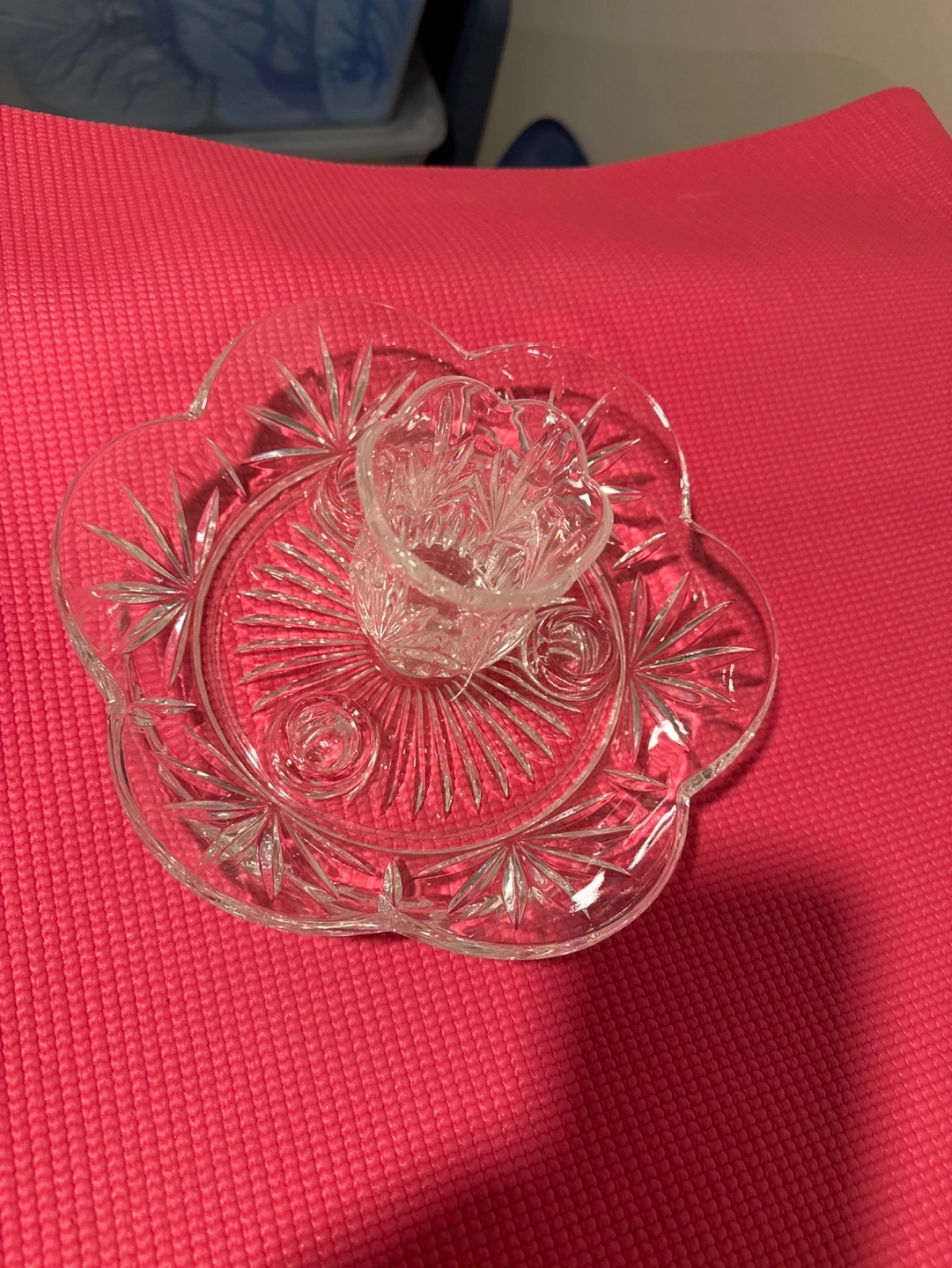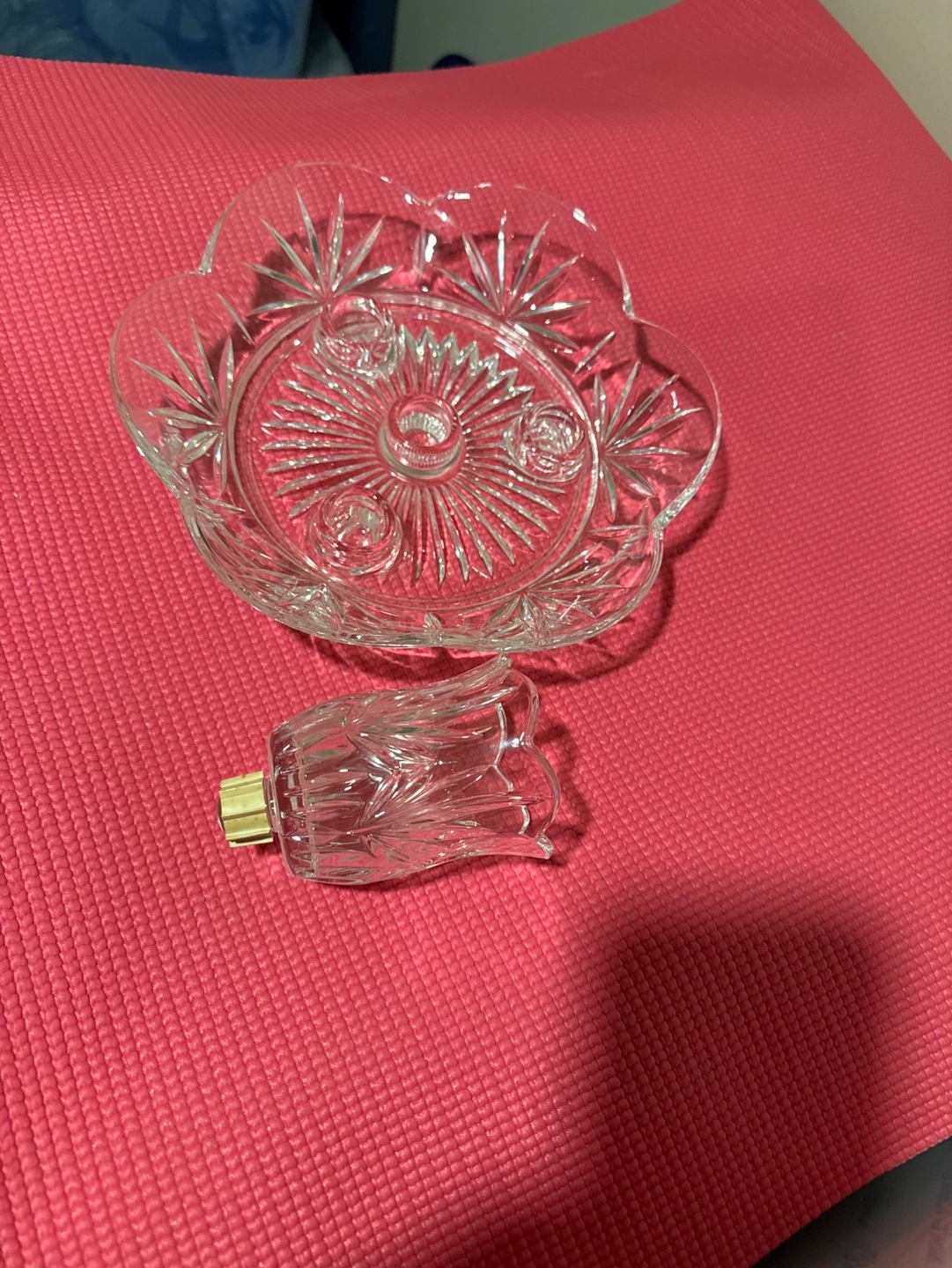 Beautiful crystal candleholder and coordinating plate. Elegant design, perfect for a centerpiece or decorative accent. You can use with all taper candles or votive with tapers or just votive with decor around it. Beautiful piece.