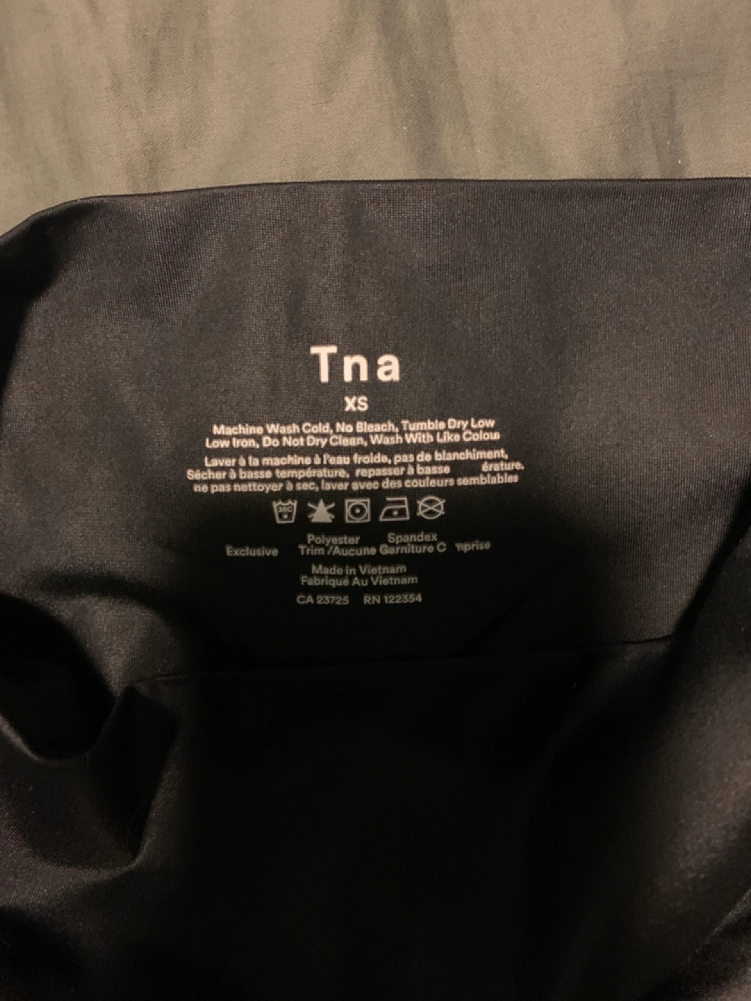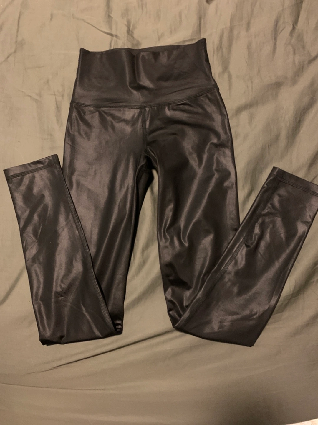 Shiny black leggings. High-waisted. Size XS. Made in Vietnam. Polyester and spandex blend.