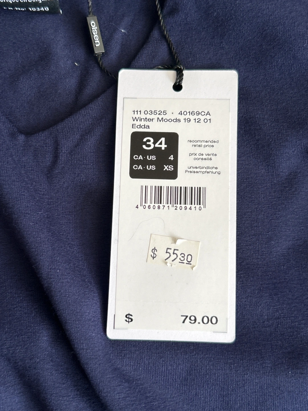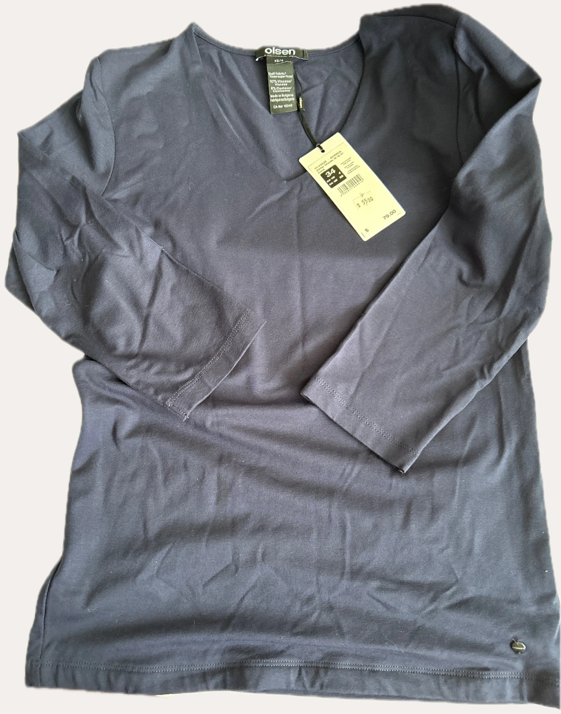 Olsen - Navy Blue - 3/4 sleeve v-neck top. 92% viscose, 8% elastane. Made in Bulgaria. New with tag. Excellent quality. Smoke/Pet free home. Cash and pick up only please.