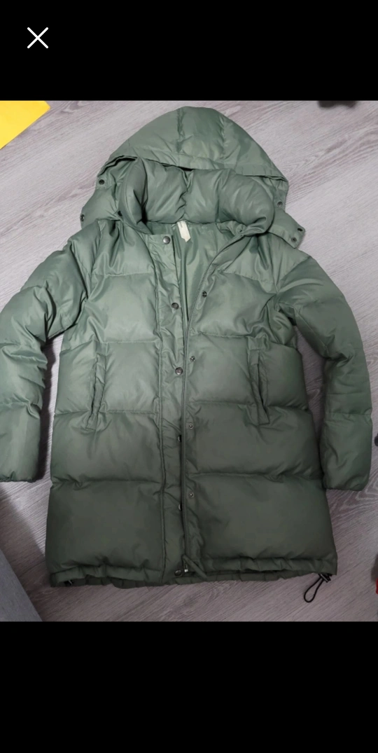 Long-length puffer jacket. Features a hood and snap button closure. Olive green colour. Excellent for colder weather.