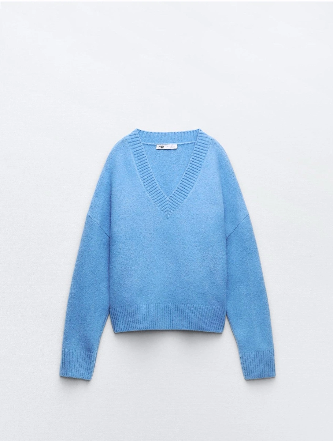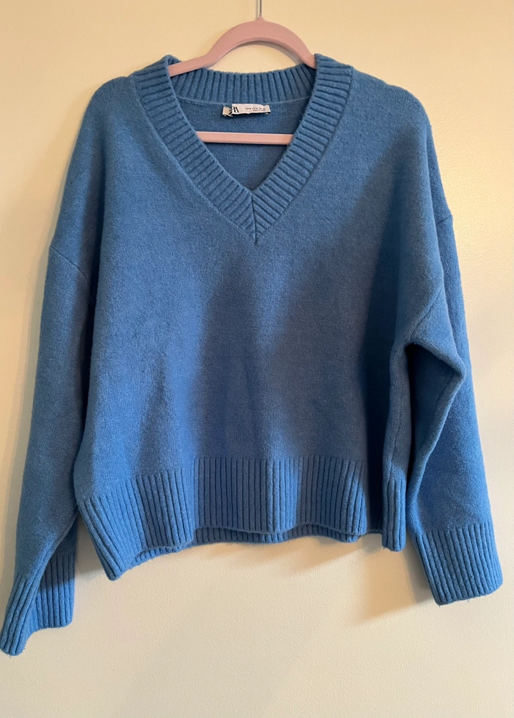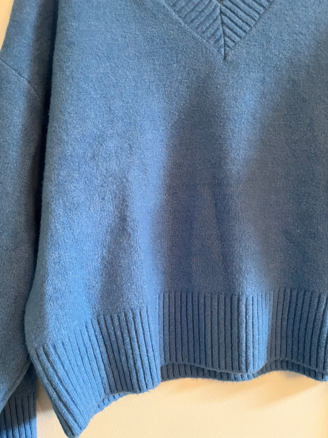Women's light blue V-neck sweater. Soft knit material. Relaxed fit. Some pilling. Good used condition.