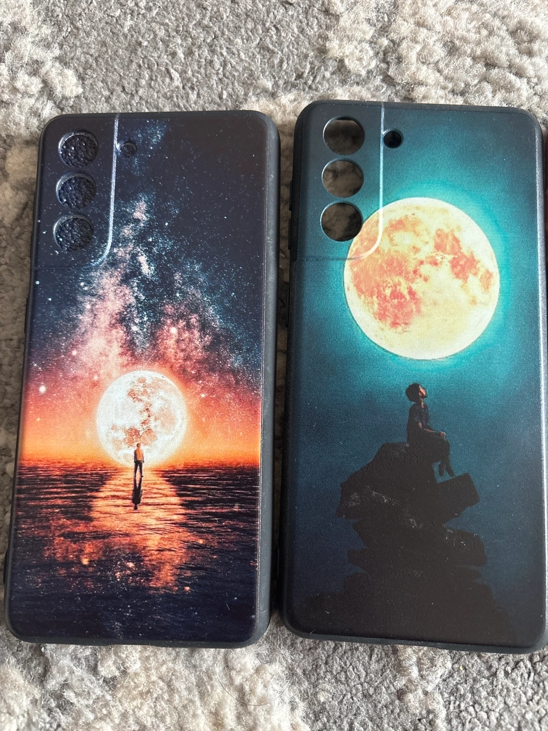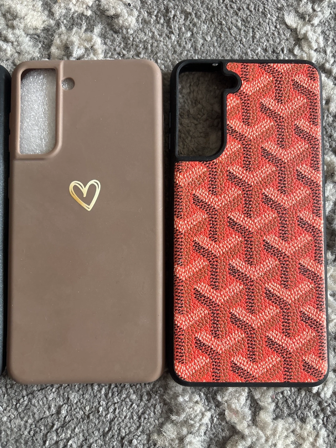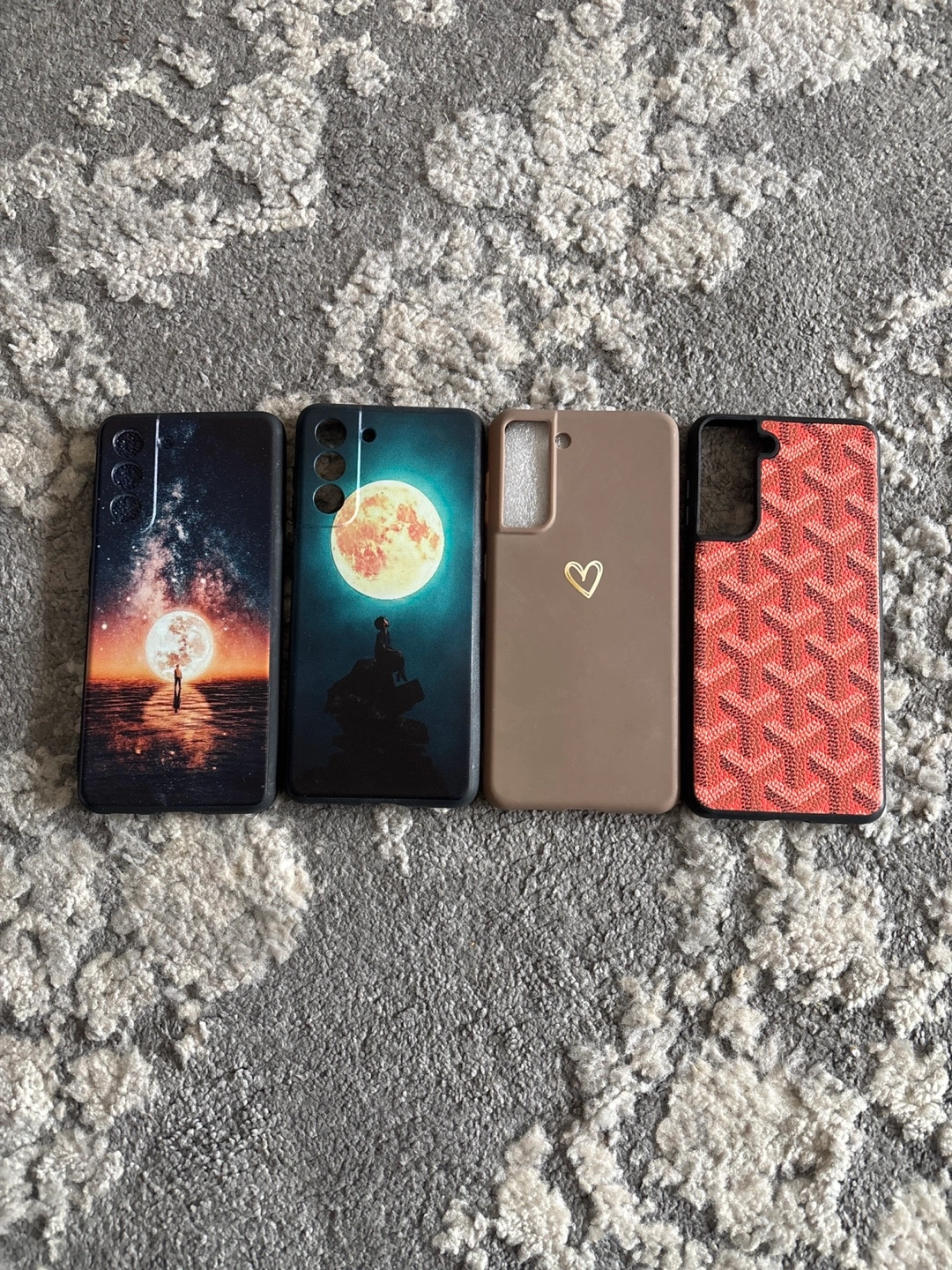 Four phone cases for Samsung Galaxy S21. Two feature celestial designs, one a minimalist taupe colour with gold heart, and one a red and black geometric pattern. Protective and stylish. Please always text if you want one. Thanks