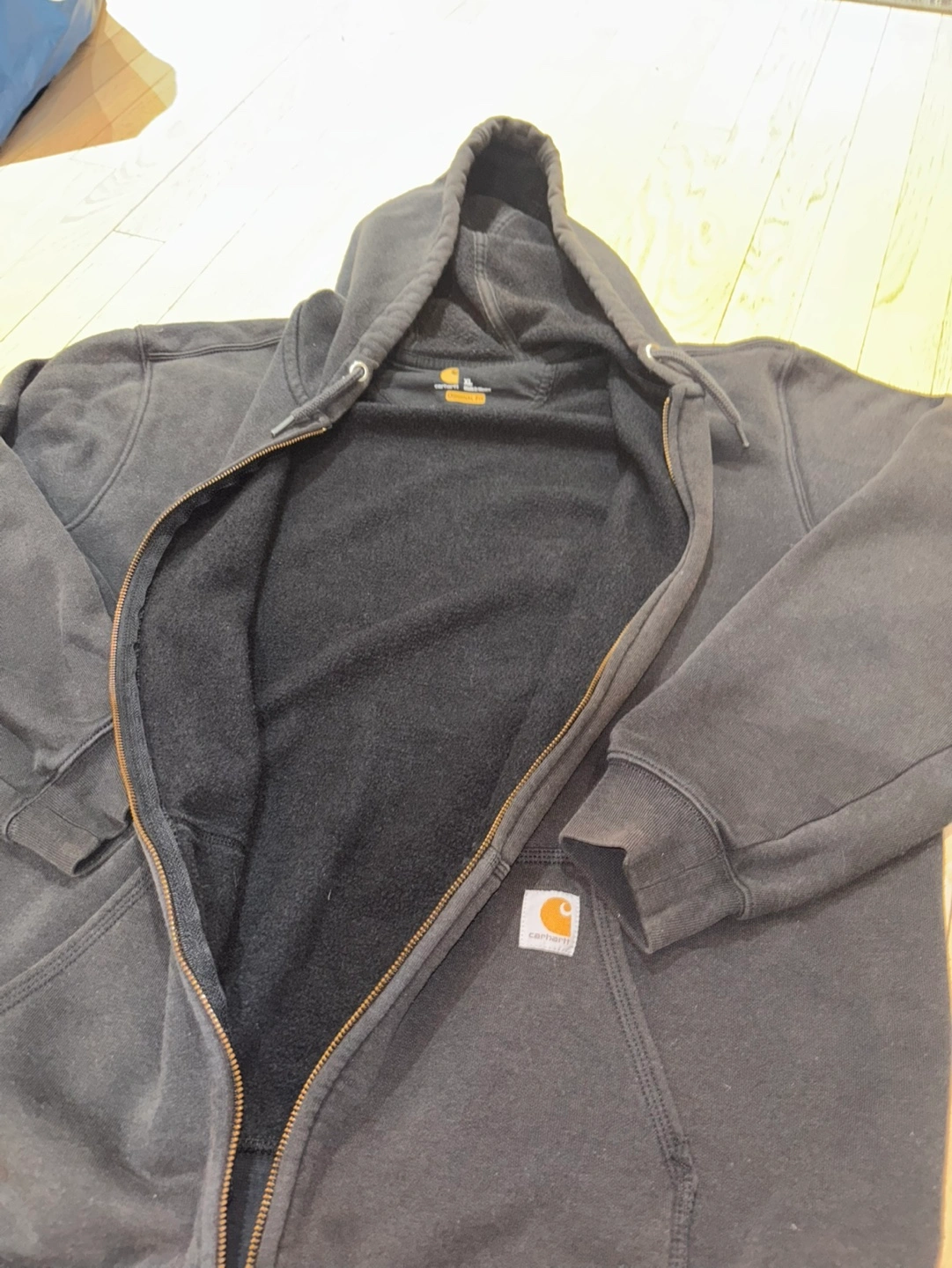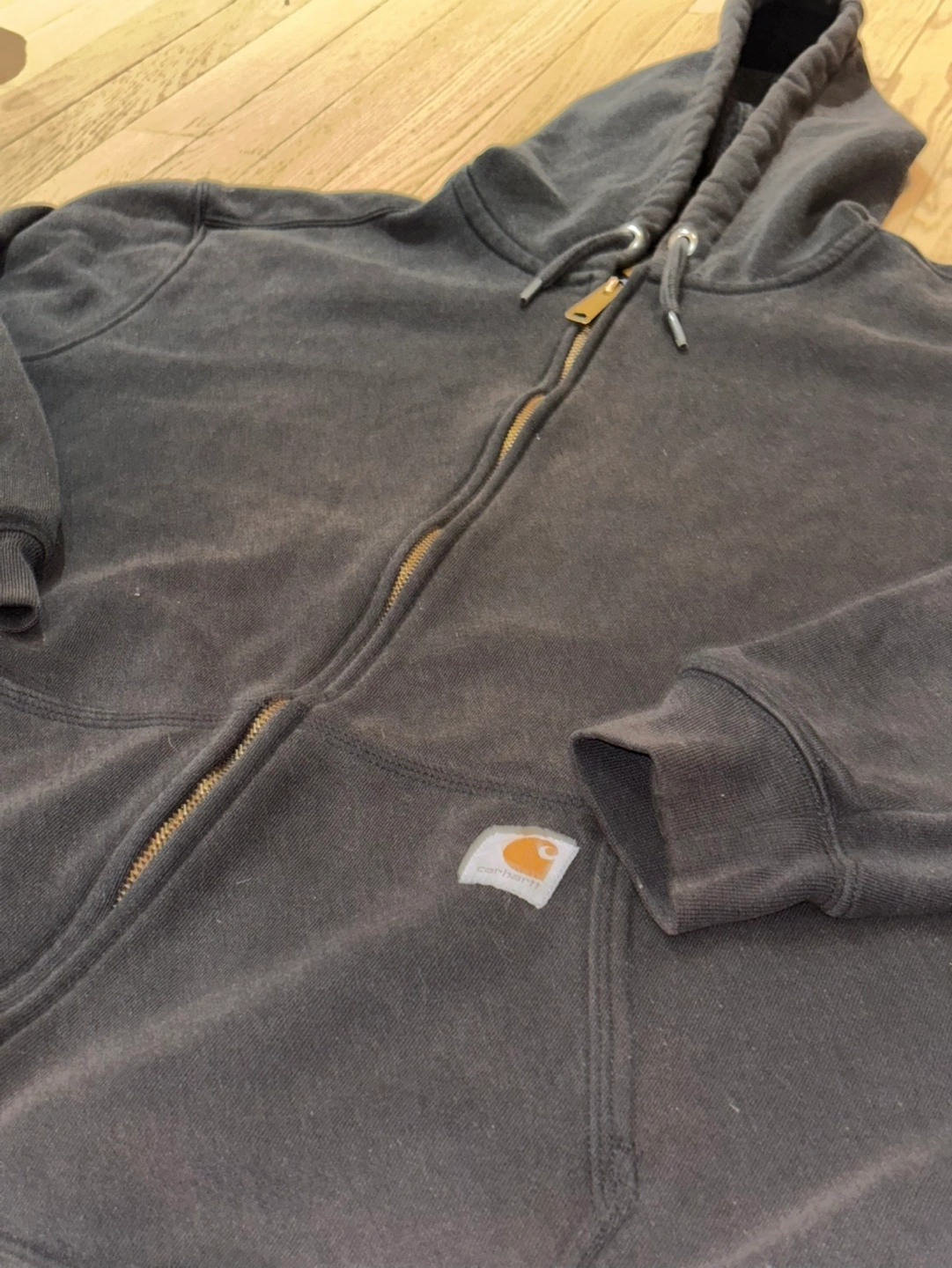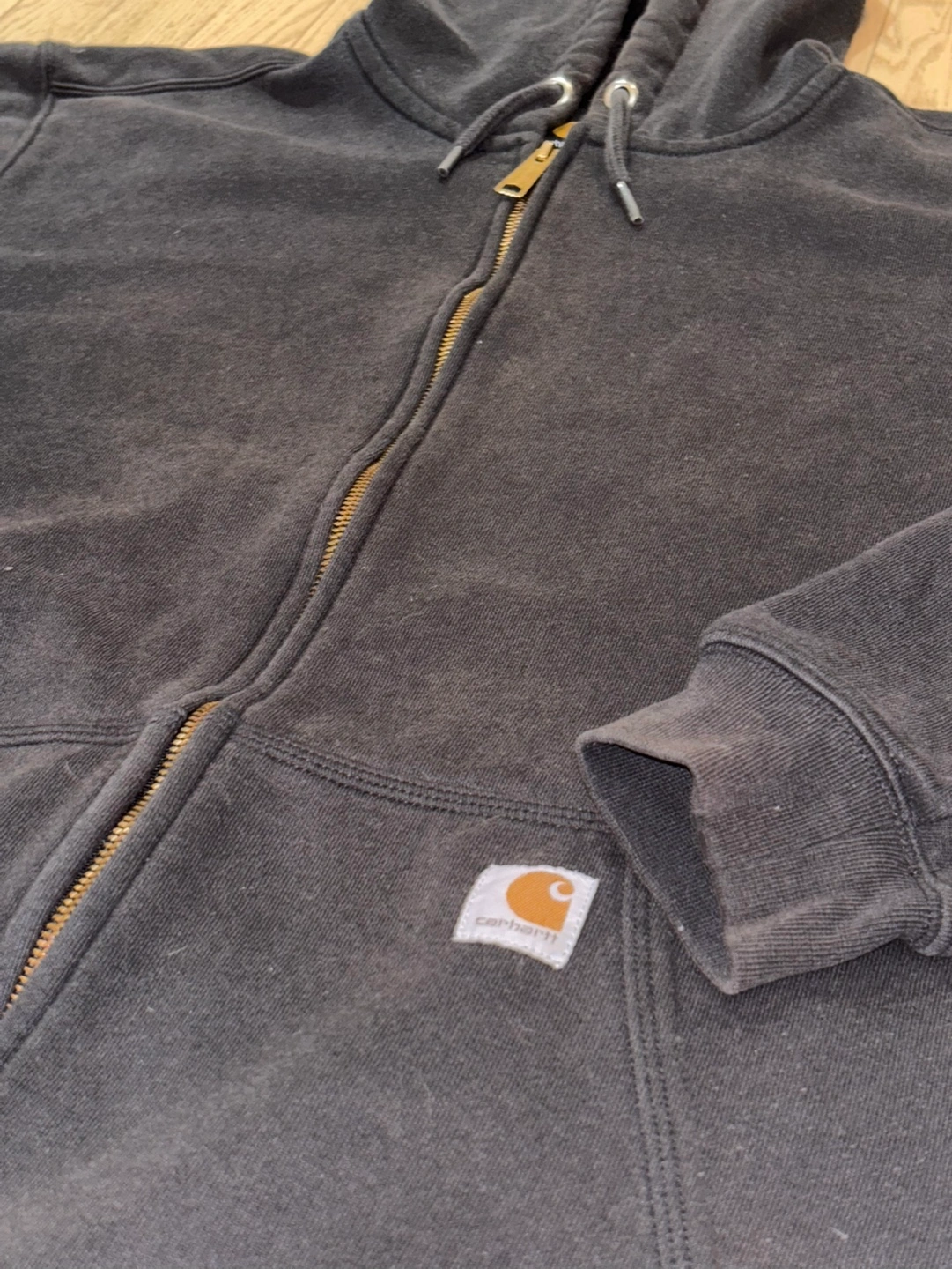 Vintage Men's Carhartt black zip-up hoodie. Full zip closure.