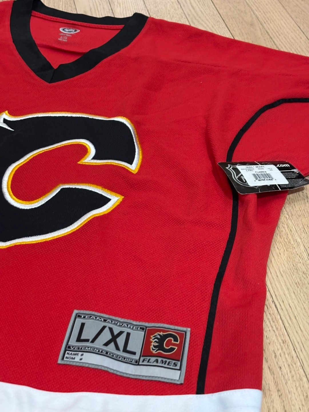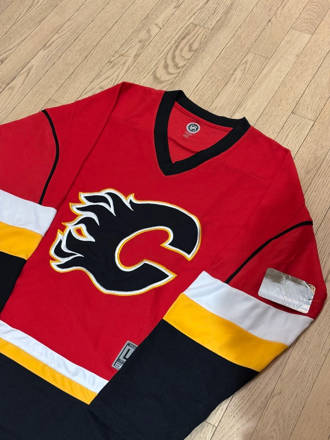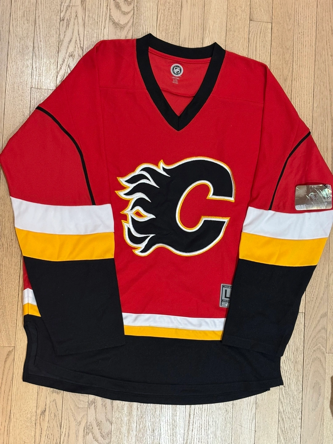 Men's Calgary Flames hockey jersey. Size XXL. Red, black, white and gold colours. V-neck. Long sleeves. Team Apparel brand. New with tags.