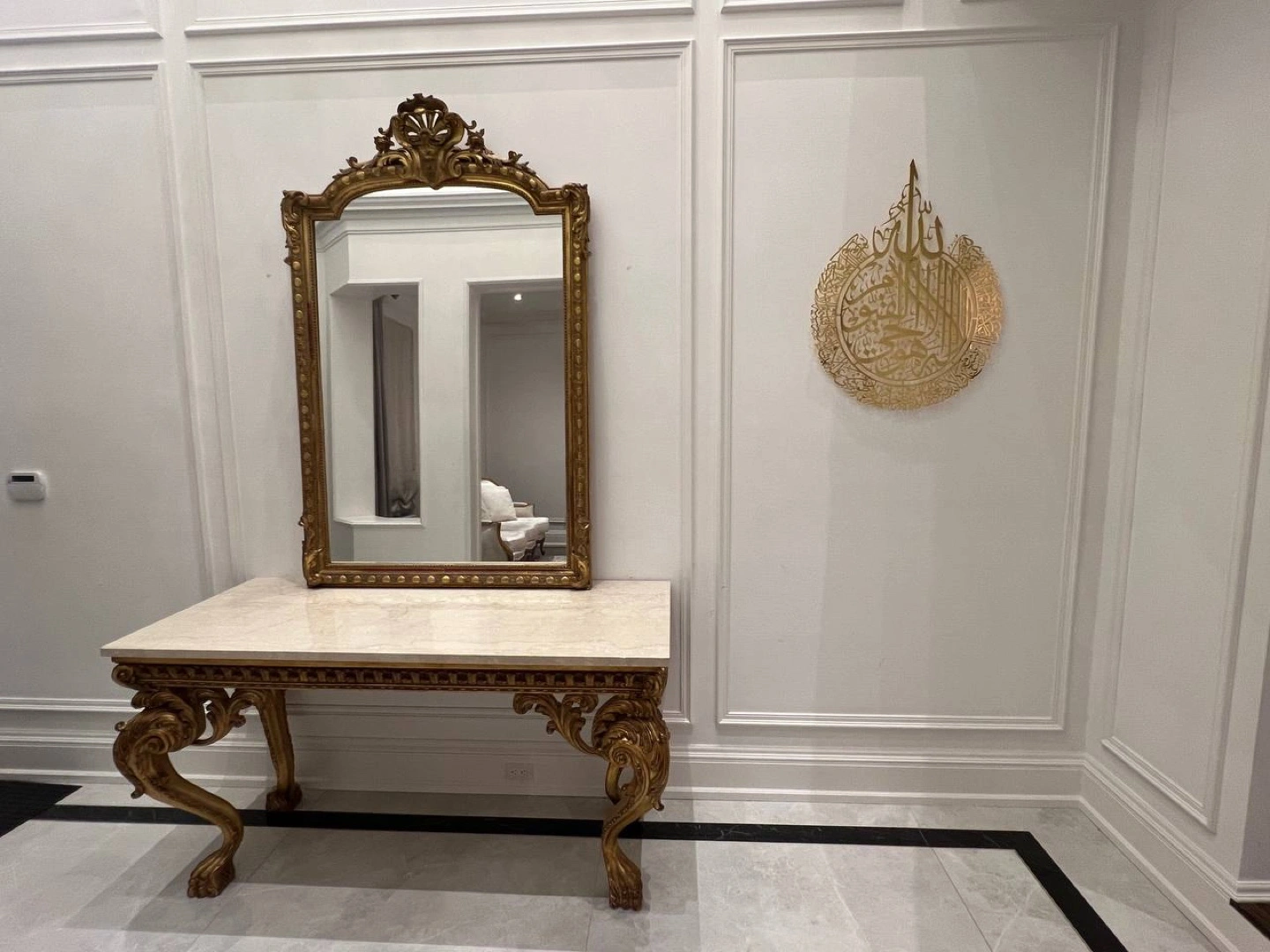 Large, ornately framed mirror. Gold coloured frame. Arched top. Beautiful statement piece. Luxury gold console table and mirror. Both for $3500 Console table: 68 inches Lenght Height: 36 inches Width: 29.5 inches Mirror: 69 inches height Lenght: 44 inches