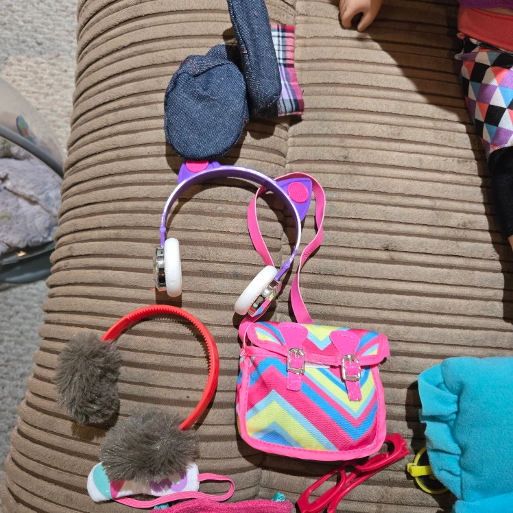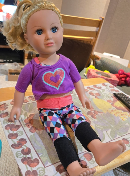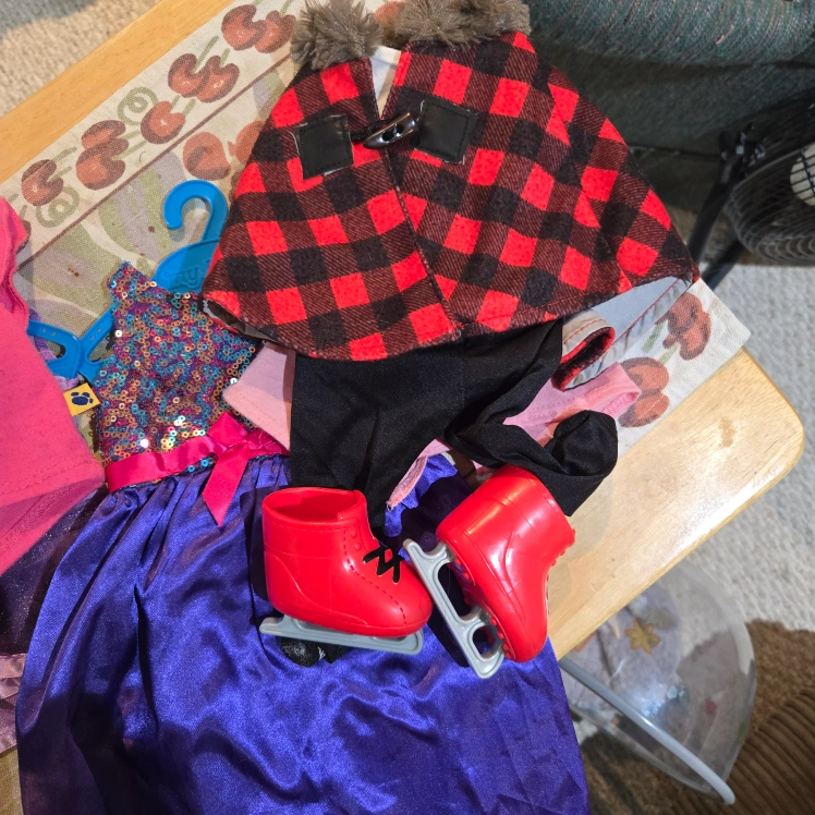 "My Life As" 18 Inch Doll & bundle of clothes. Includes multiple outfits, leggings, a robe, and accessories. Some items show minor wear.