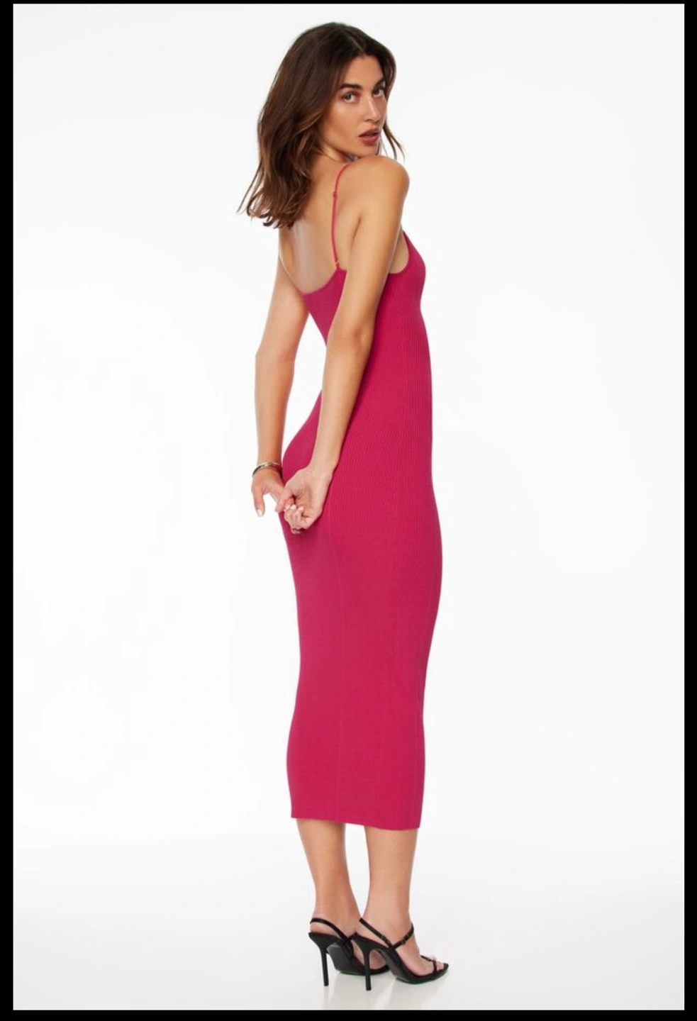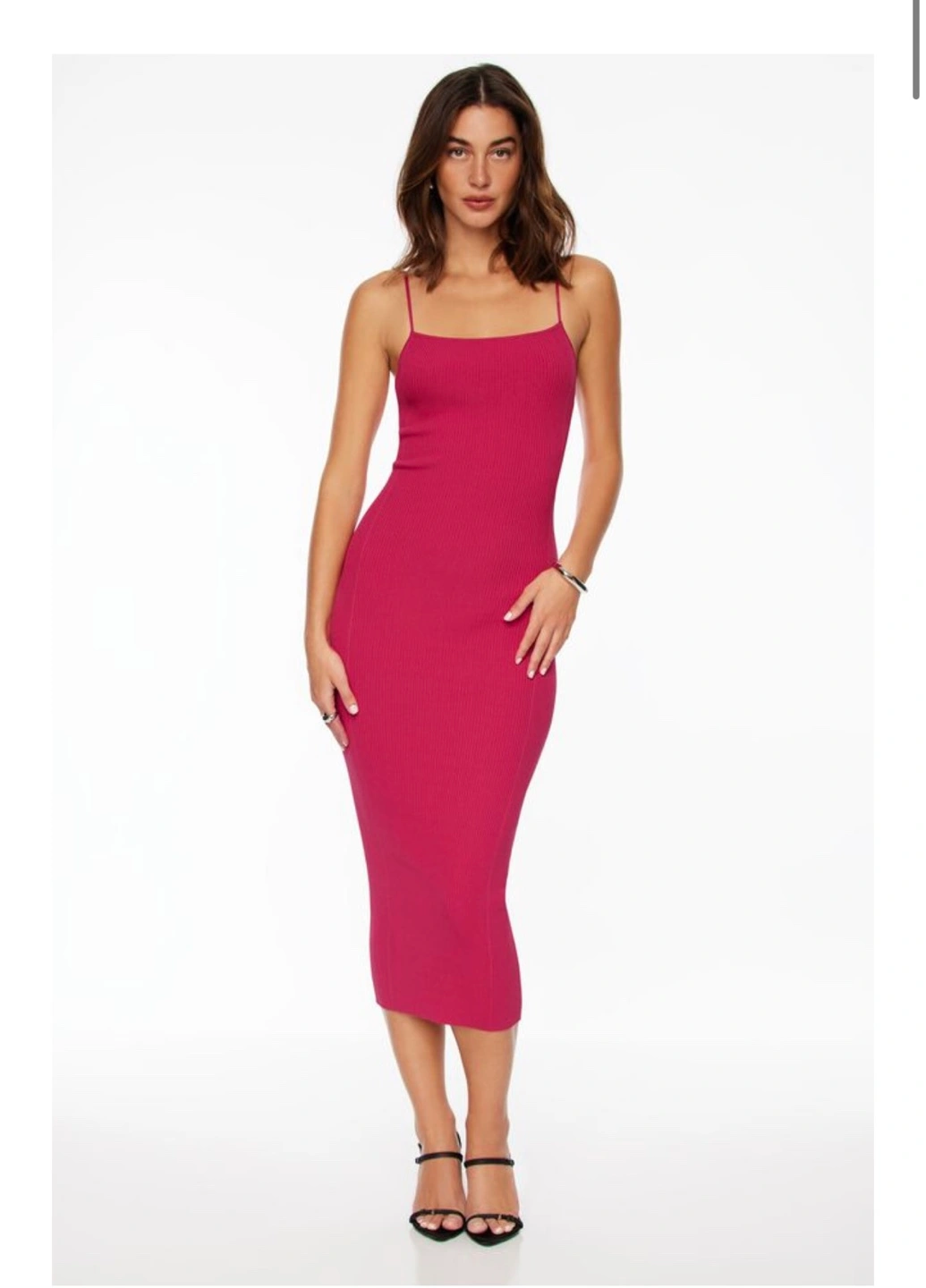 NWT. Gorgeous! New/Never worn. Pink ribbed bodycon midi dress. Spaghetti straps. True to size. PRODUCT DETAILS Slip into this square neck rib knit dress - Designed to be fitted with a stretch to accentuate your form. Features Square neck Adjustable shoulder straps Size & Fit Fitted Stretch fabric Midi length: 41" Materials & Care 55% Viscose, 25% Nylon, 20% Spandex Hand wash, cold Imported