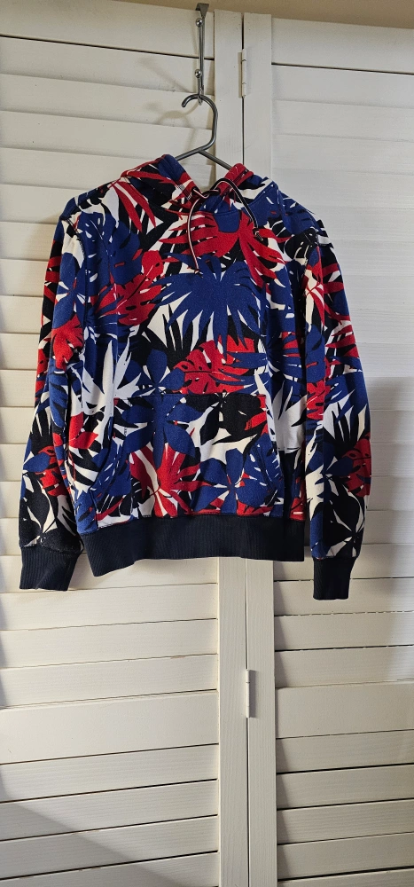 Youth sized hoodie. Features a vibrant tropical leaf print in shades of red, blue, and white. Drawstring hood. Kangaroo pocket. Approximate measurements provided in images. please ✔️check✅️✅️✅️ my listing lots of items from $1 to $5 in my listing