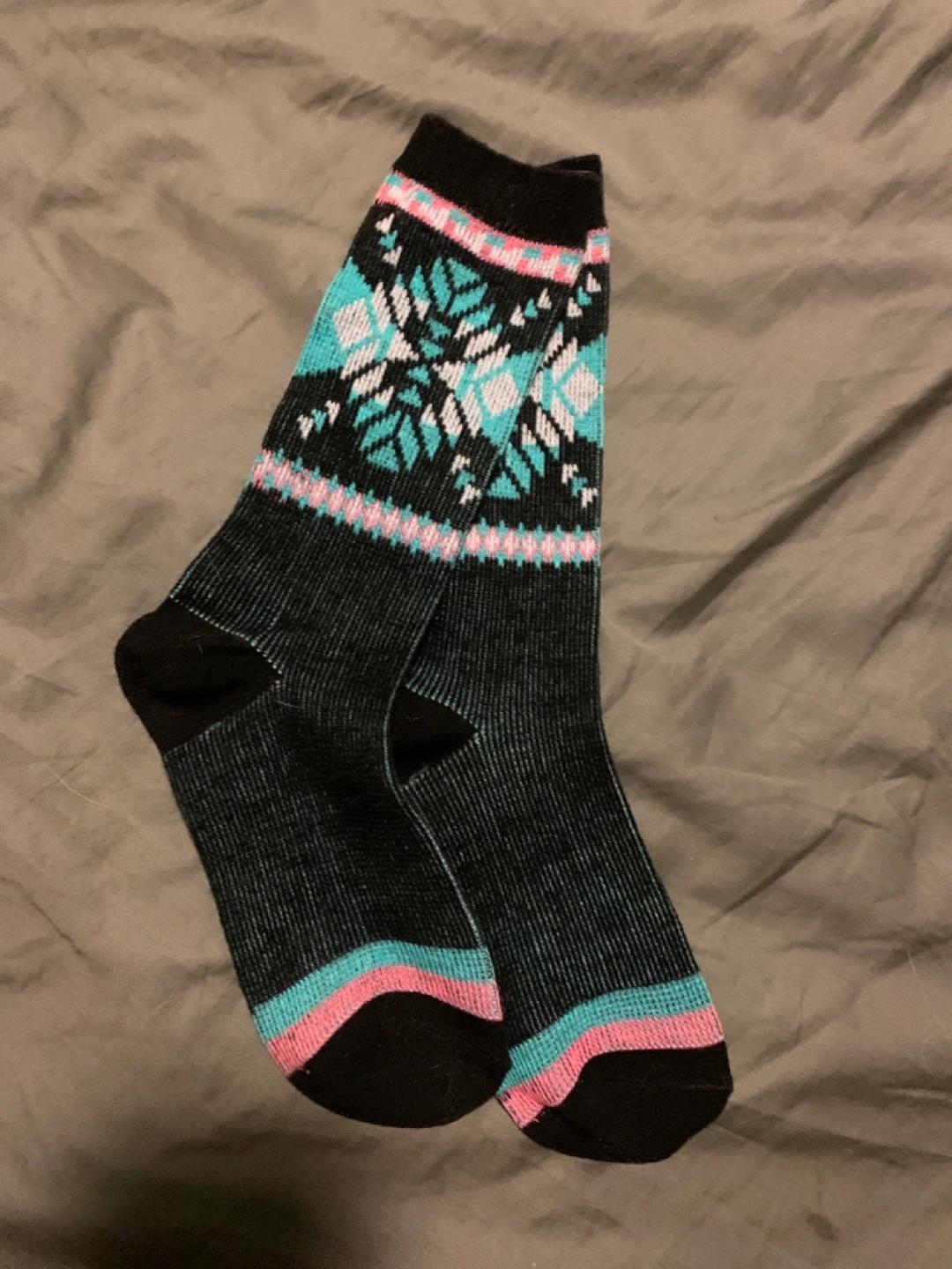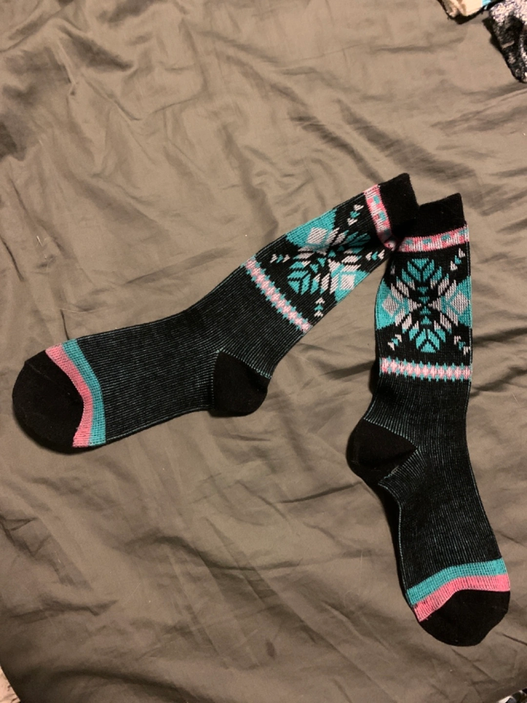 Pair of knee-high socks. Black base colour with teal and pink snowflake pattern. Warm and comfortable for cold weather.
