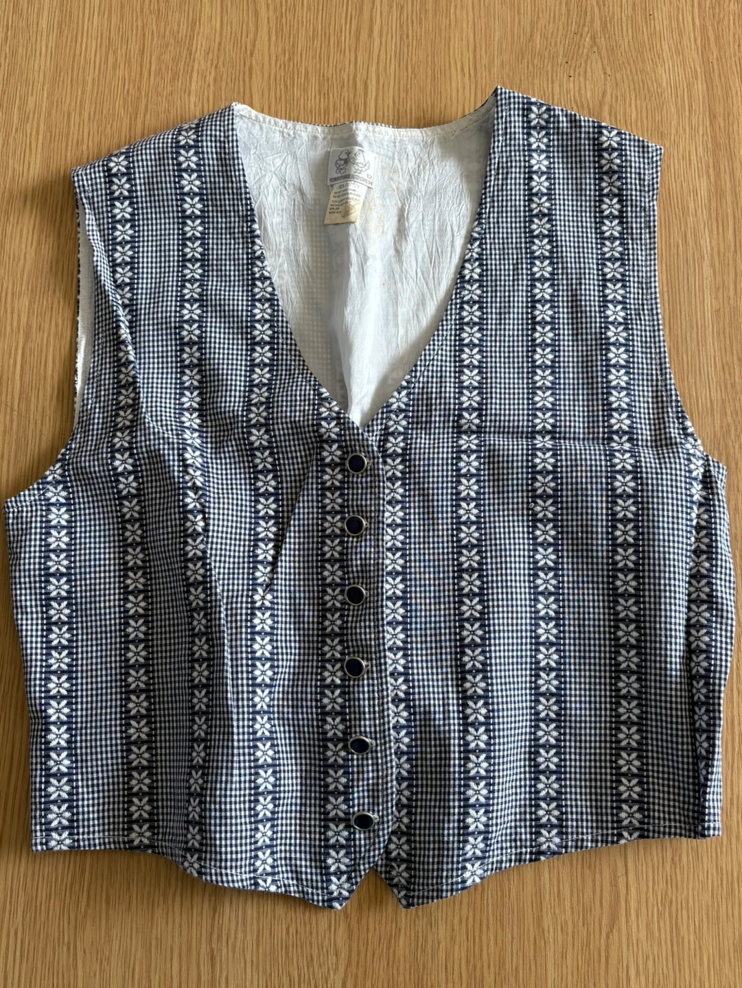 Adorable girls' outfit. Includes a blue and white gingham vest with embroidered flowers, matching shorts with lace trim, and a grey tank top. Great for summer. Vest buttons down the front. Shorts have an elastic waistband. Brand: Chickadee Duck. Size: 12. 100% cotton.