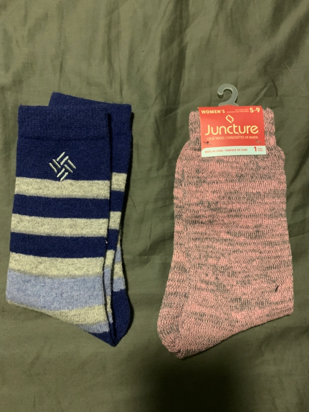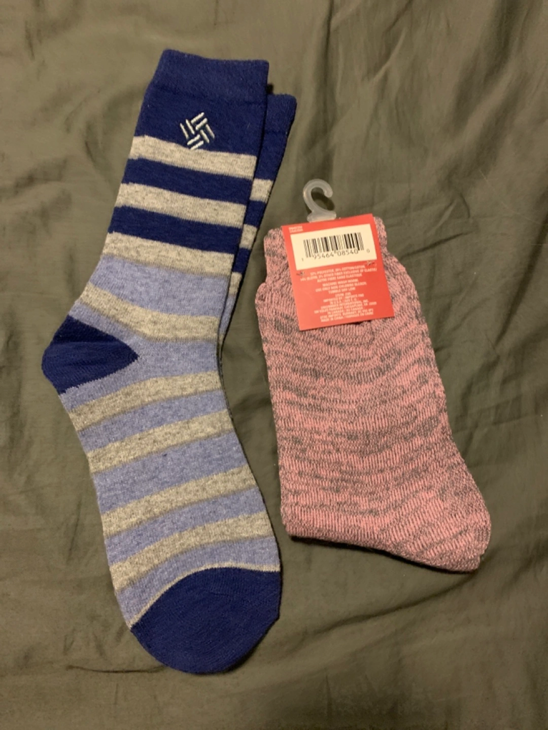 Two pairs of women's crew socks, size 5-9. One pair features a navy blue and grey striped pattern with a small logo. The other pair is a heather pink and grey blend. New, one pair with tags.