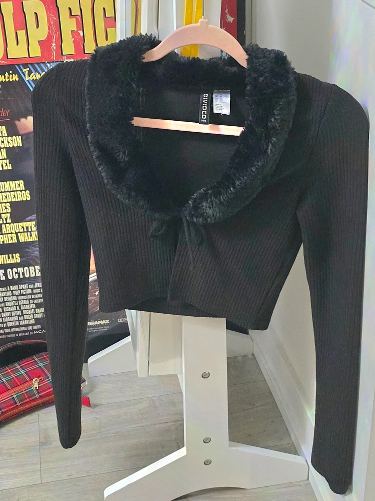 Black cropped cardigan. Features long sleeves and a faux fur collar. Stretchy, I think it'd fit a small as well! Price negotiable & open to trades.