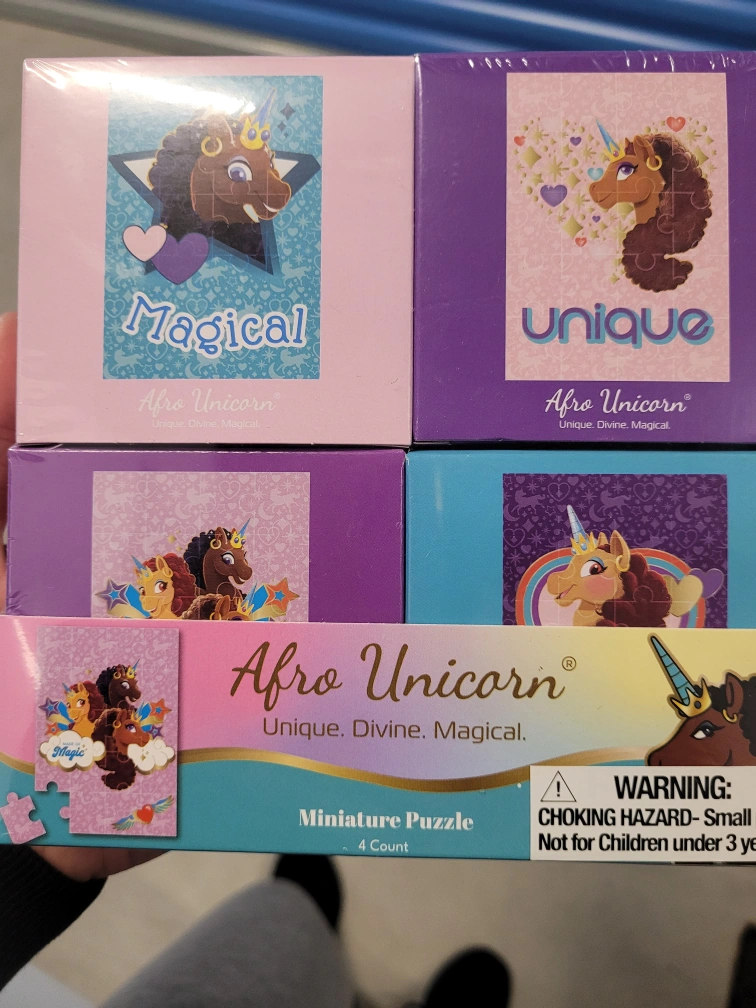 Set of four miniature puzzles. Features adorable Afro Unicorn designs. Unique, divine, magical themes. Choking hazard, not for children under 3 years. I have multiple available. great for loot bags.