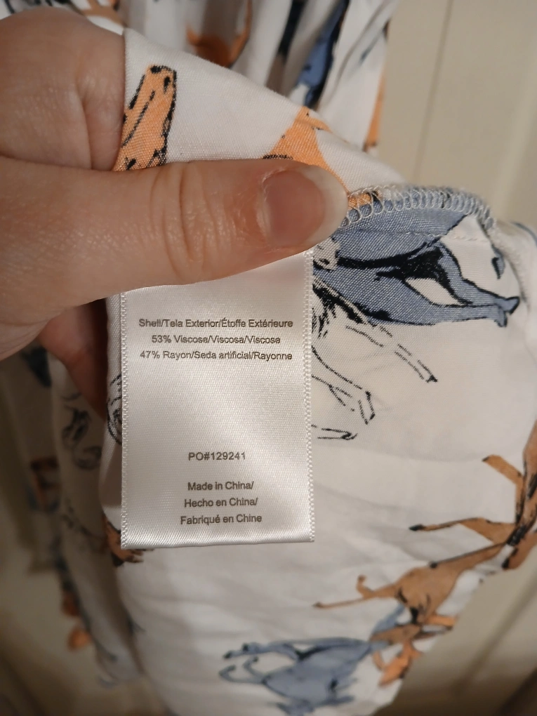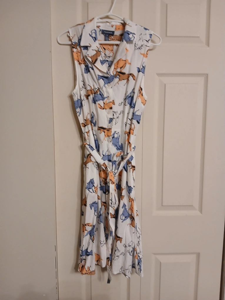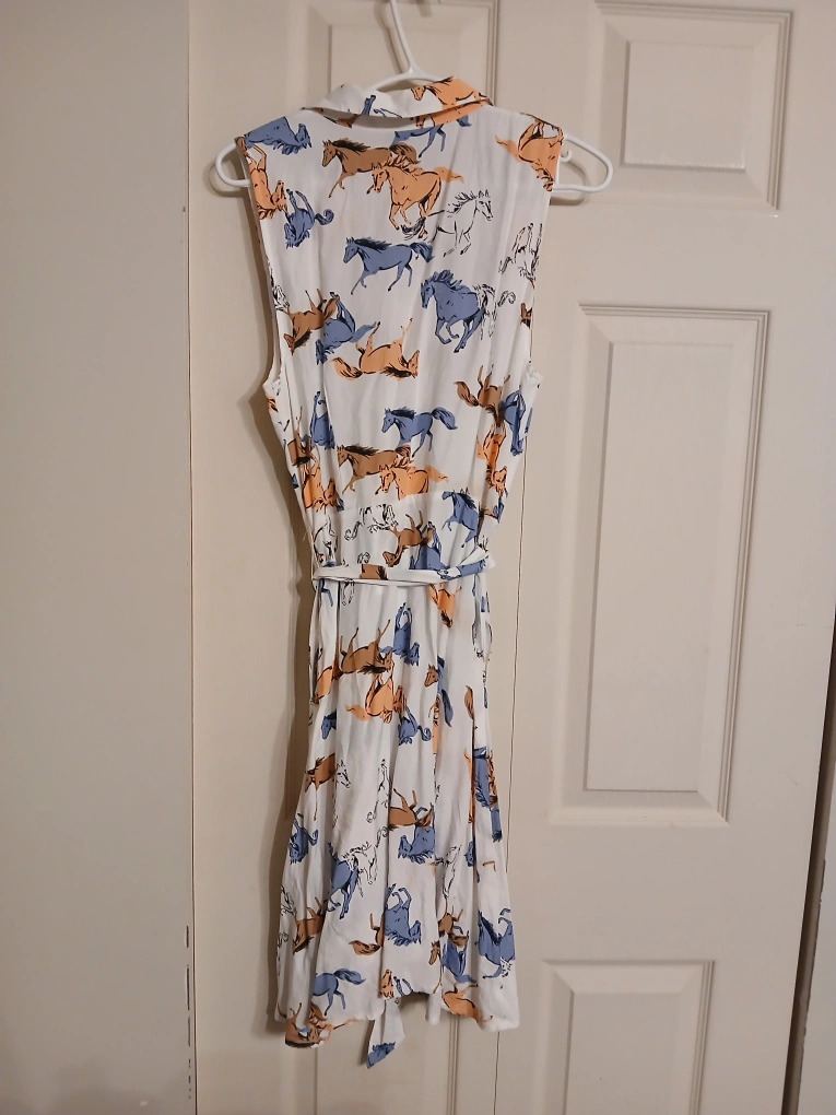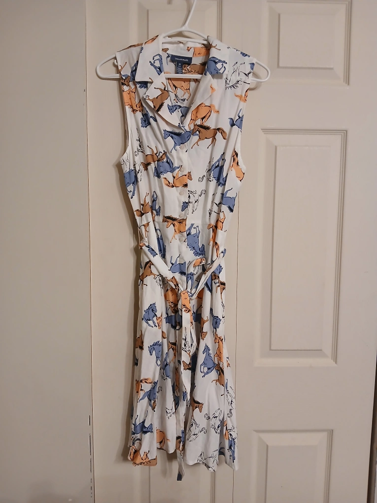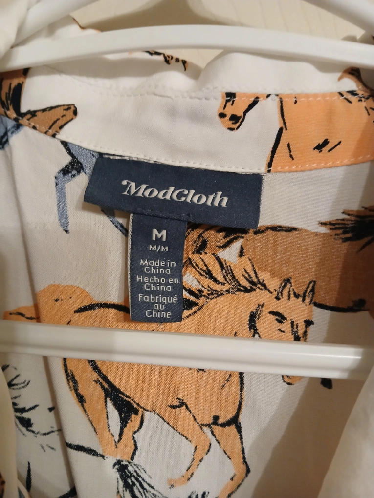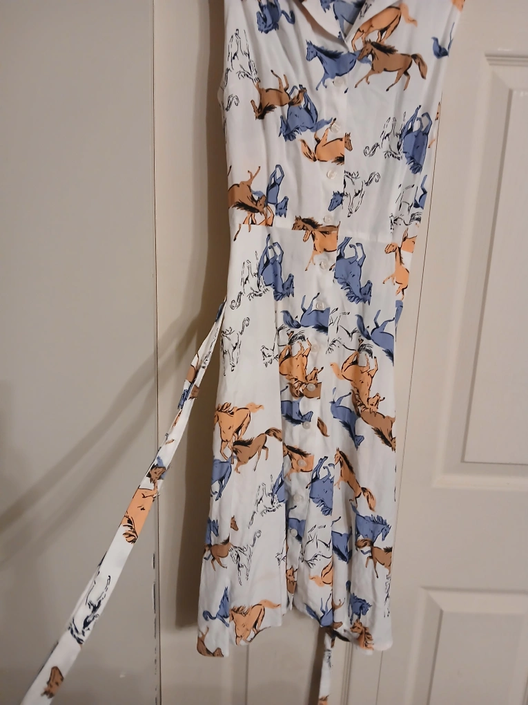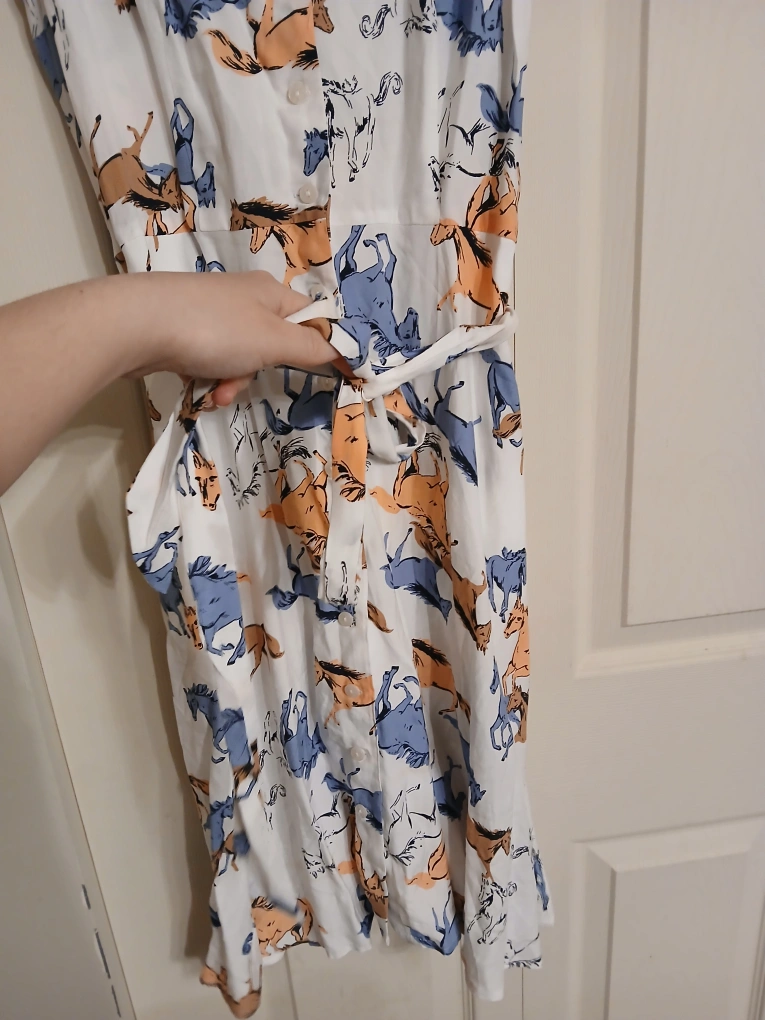 Brand: ModCloth Type: Button down dress with horses print Size: Medium (M) Colour: White with blue, light brown and orange Additional measurements: About 97 cm length, about 46 cm pit to pit Composition/materials: shell is 53% viscose and 47% rayon Condition: Excellent