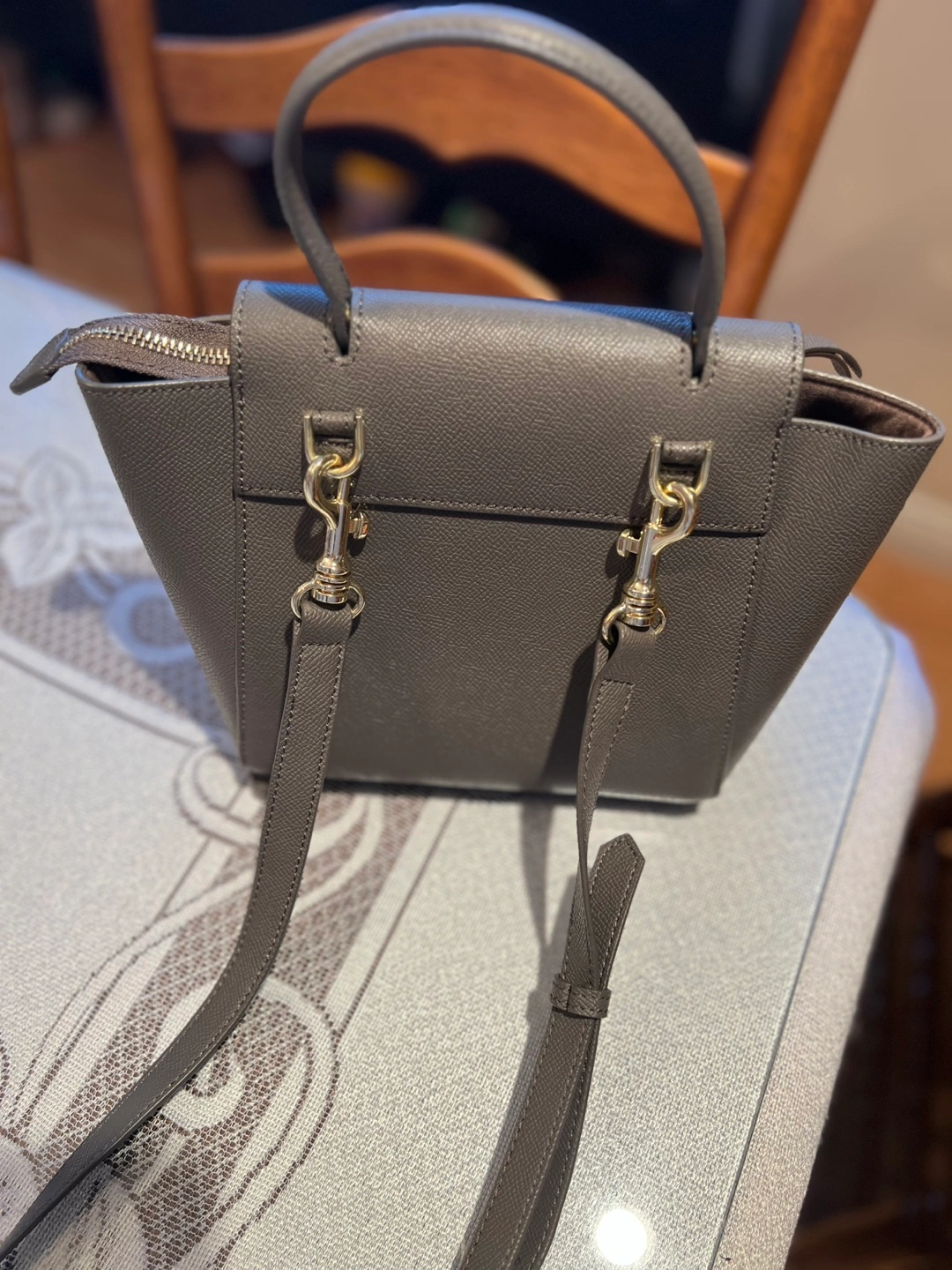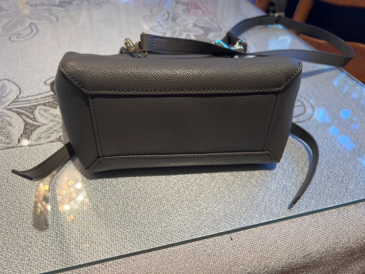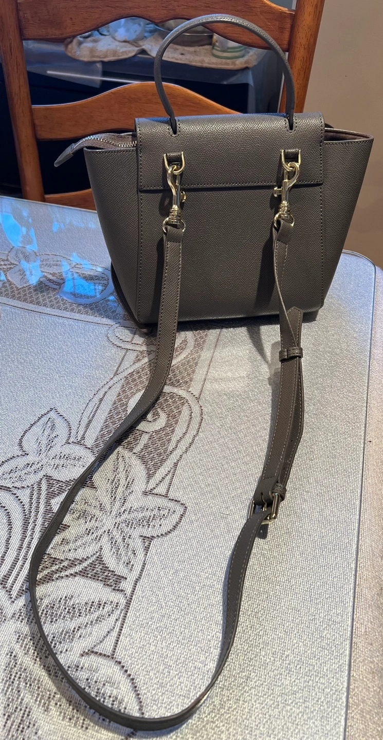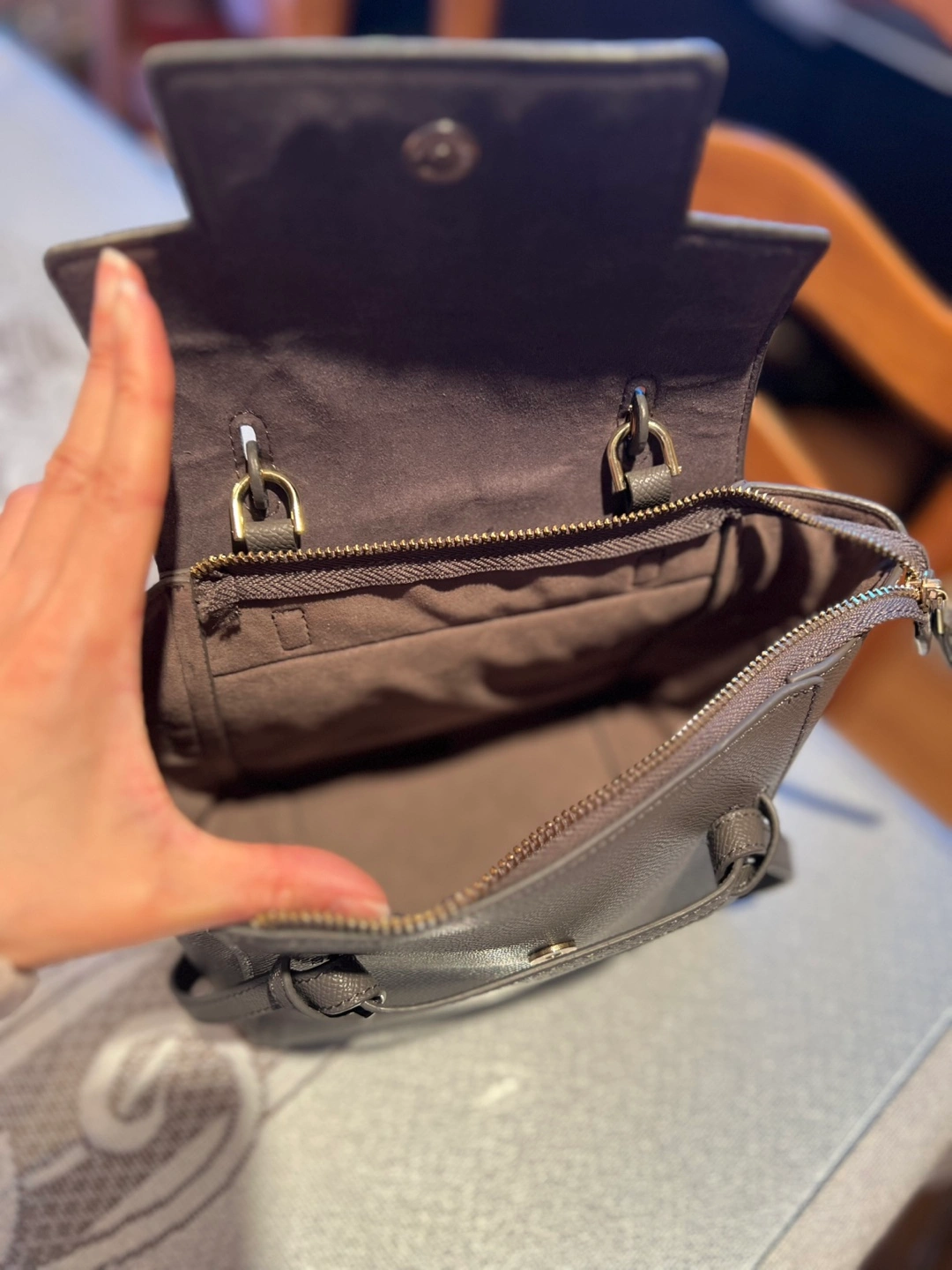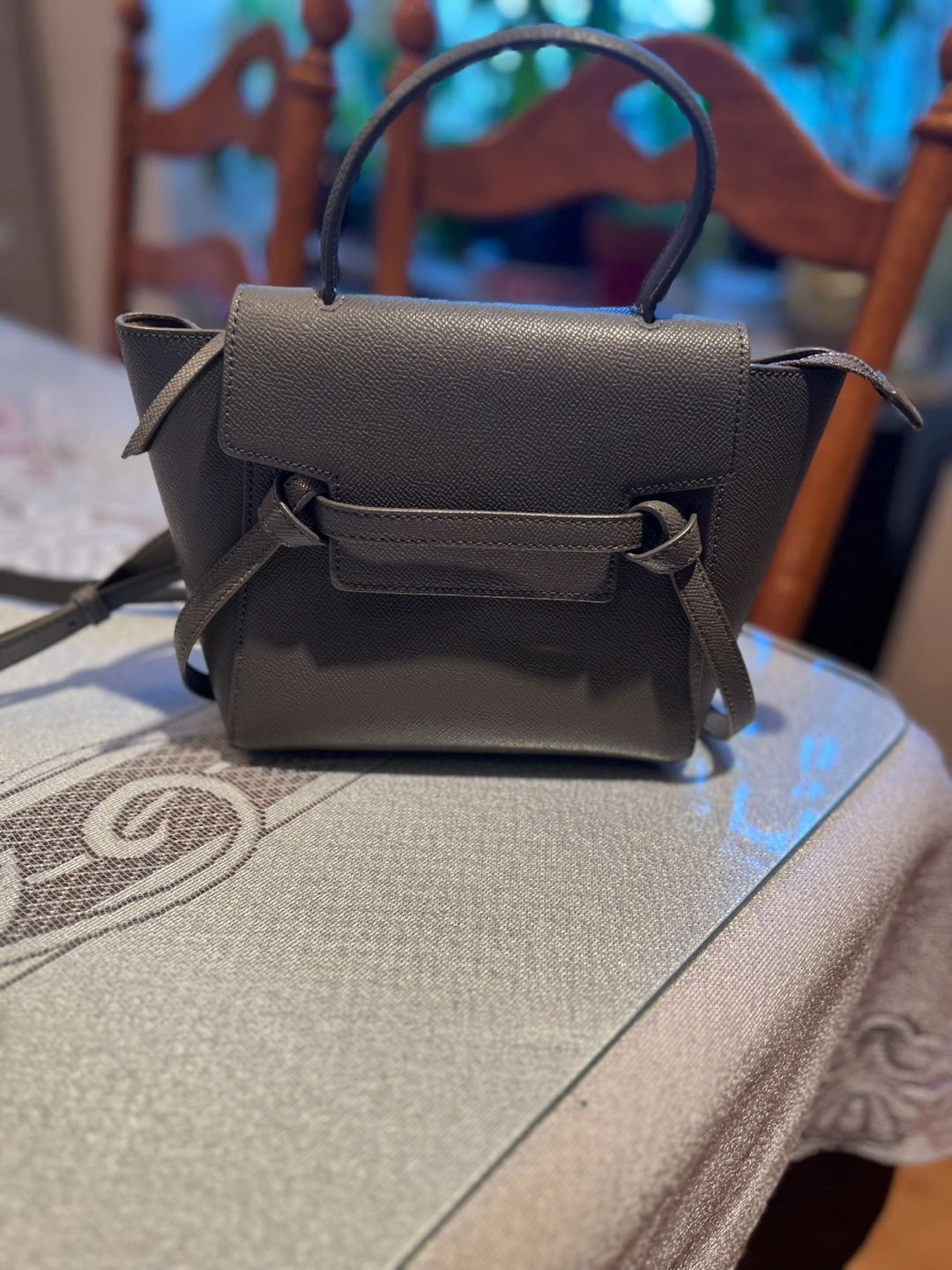 Dark Grey leather mini bag with a suede interior. Features a top handle and removable adjustable strap. Silver-toned hardware. Zip closure with magnetic button. Light and spacious purse.