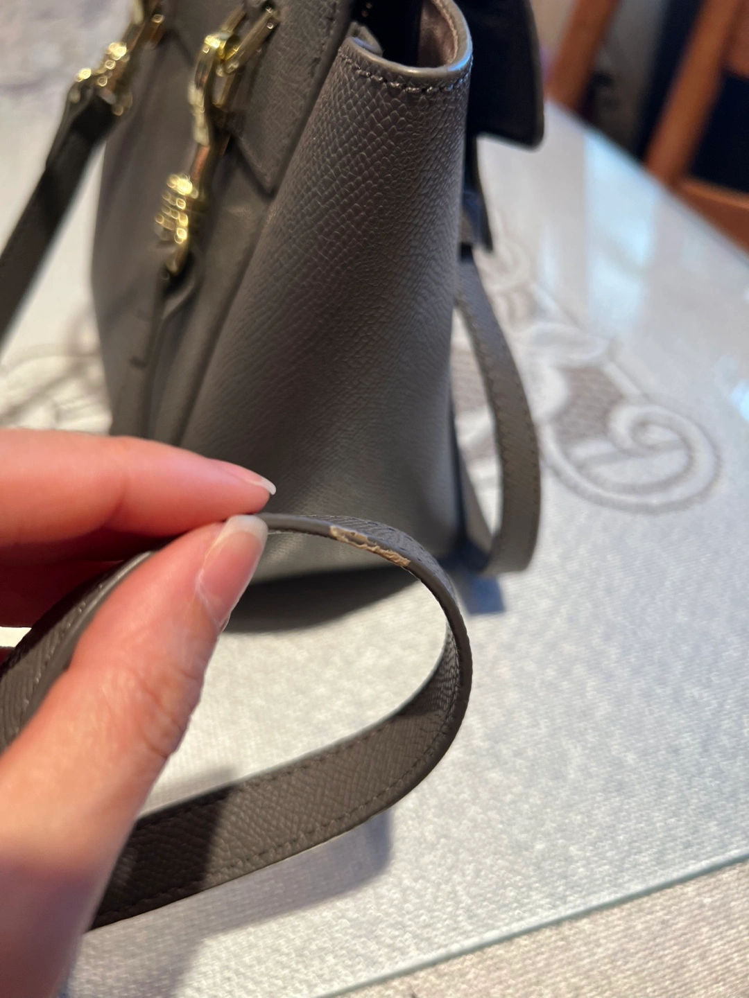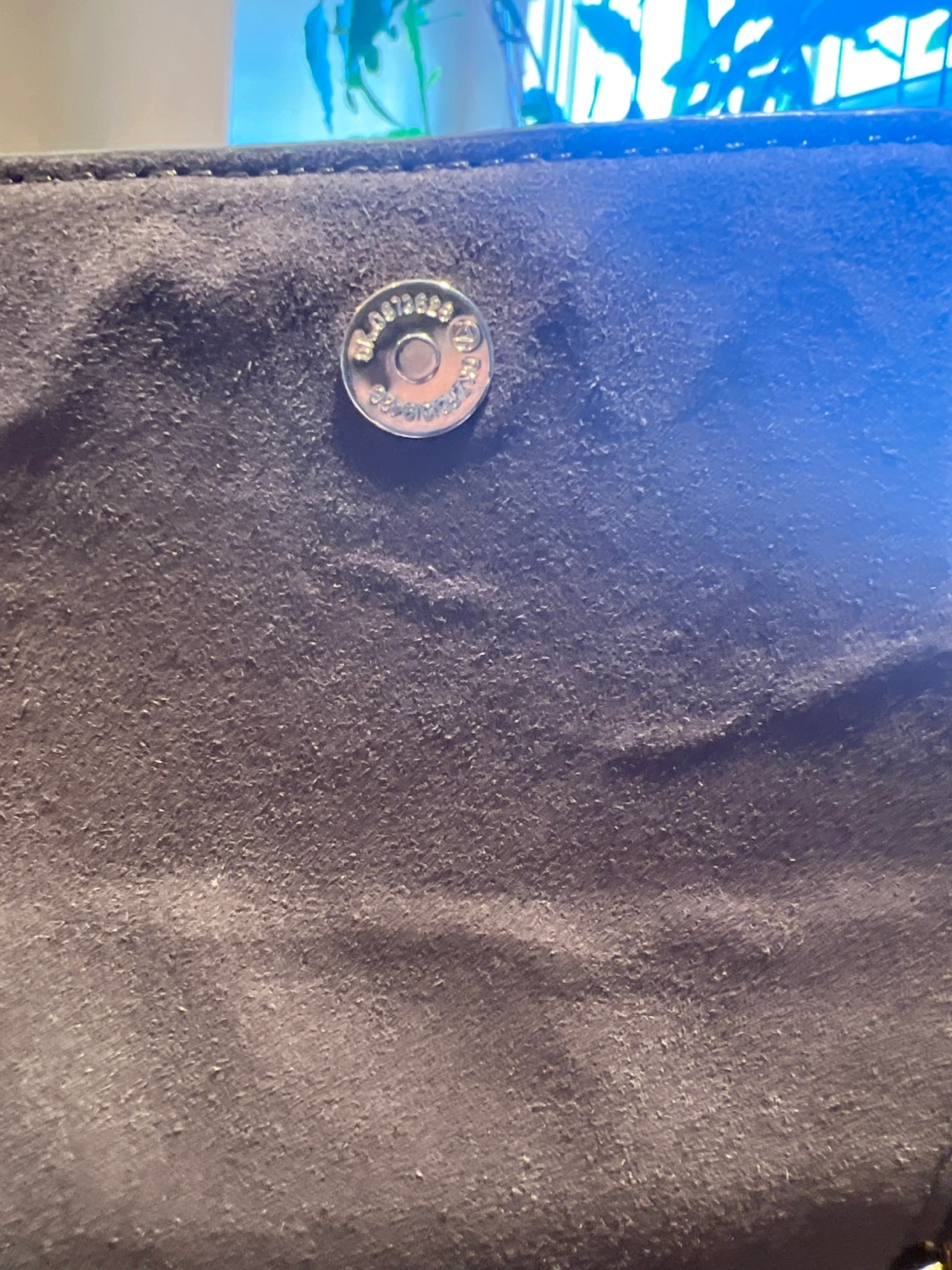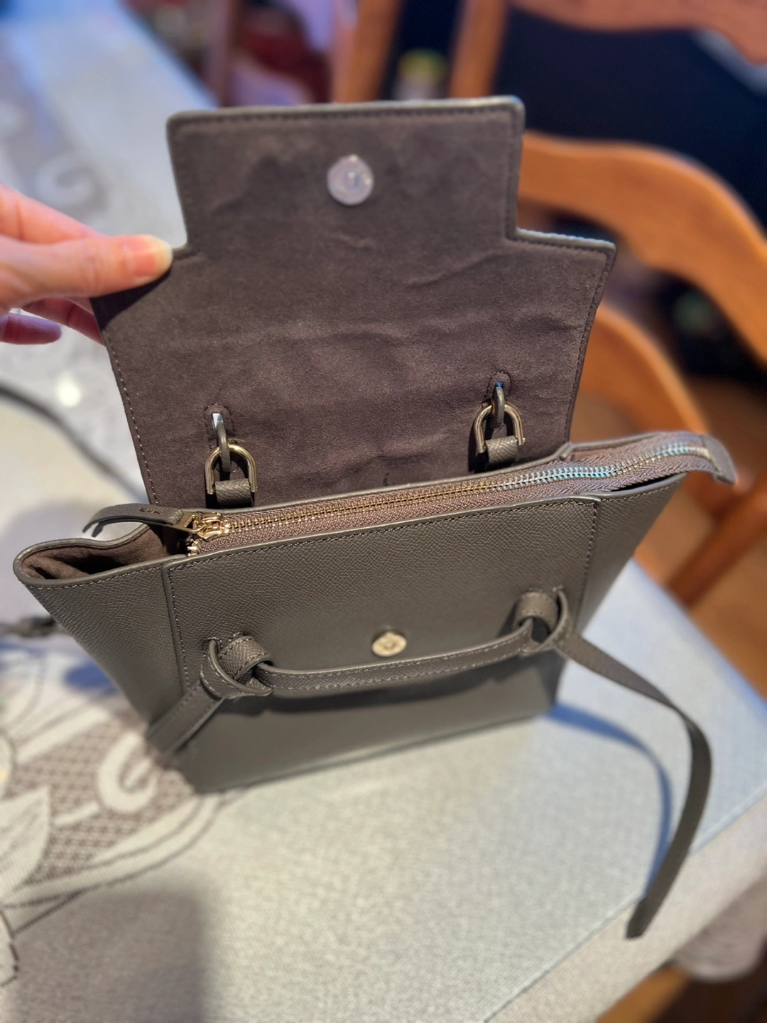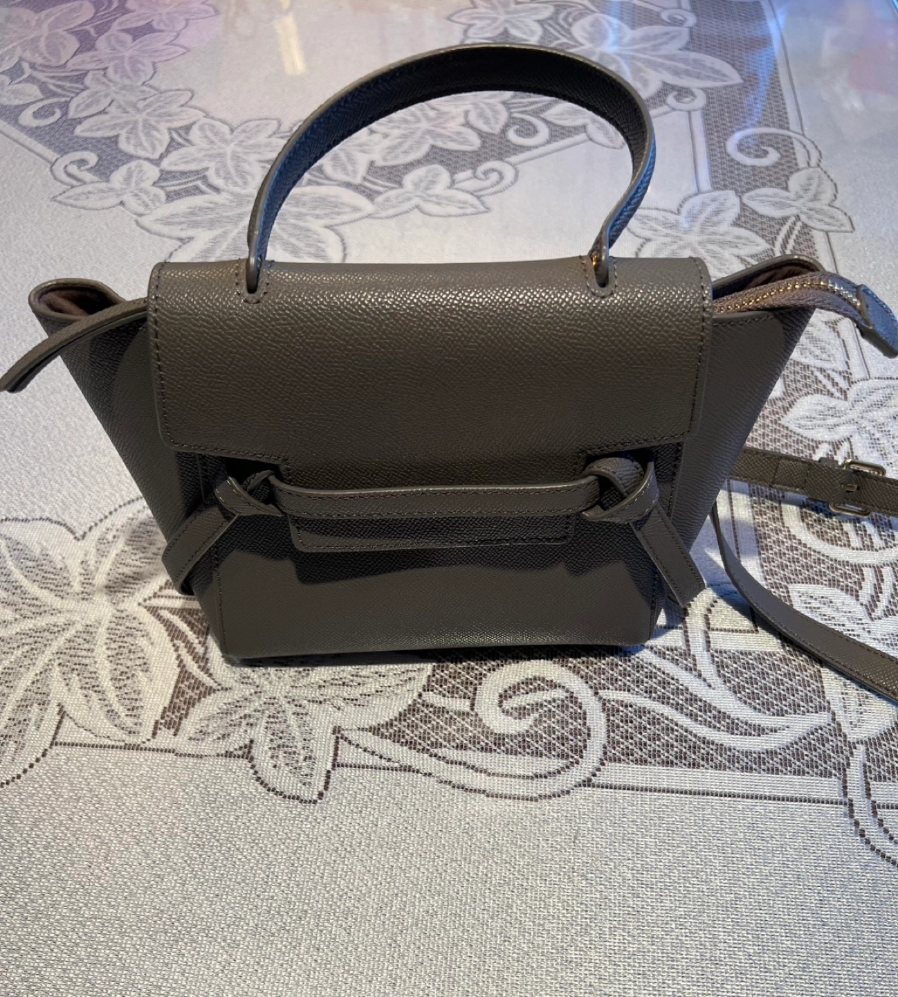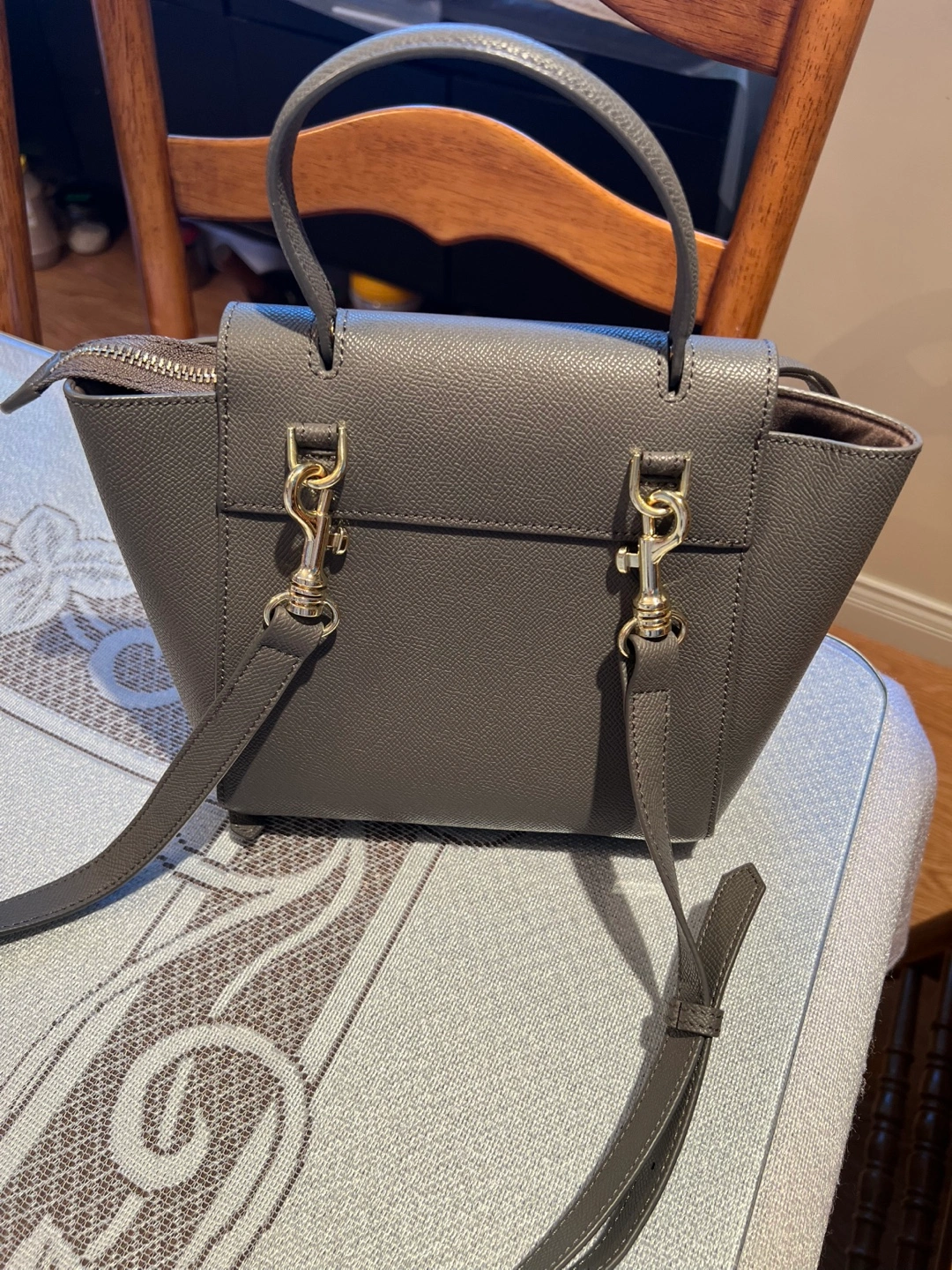 Dark Grey leather mini bag with a suede interior. Features a top handle and removable adjustable strap. Silver-toned hardware. Zip closure with magnetic button. Light and spacious purse.