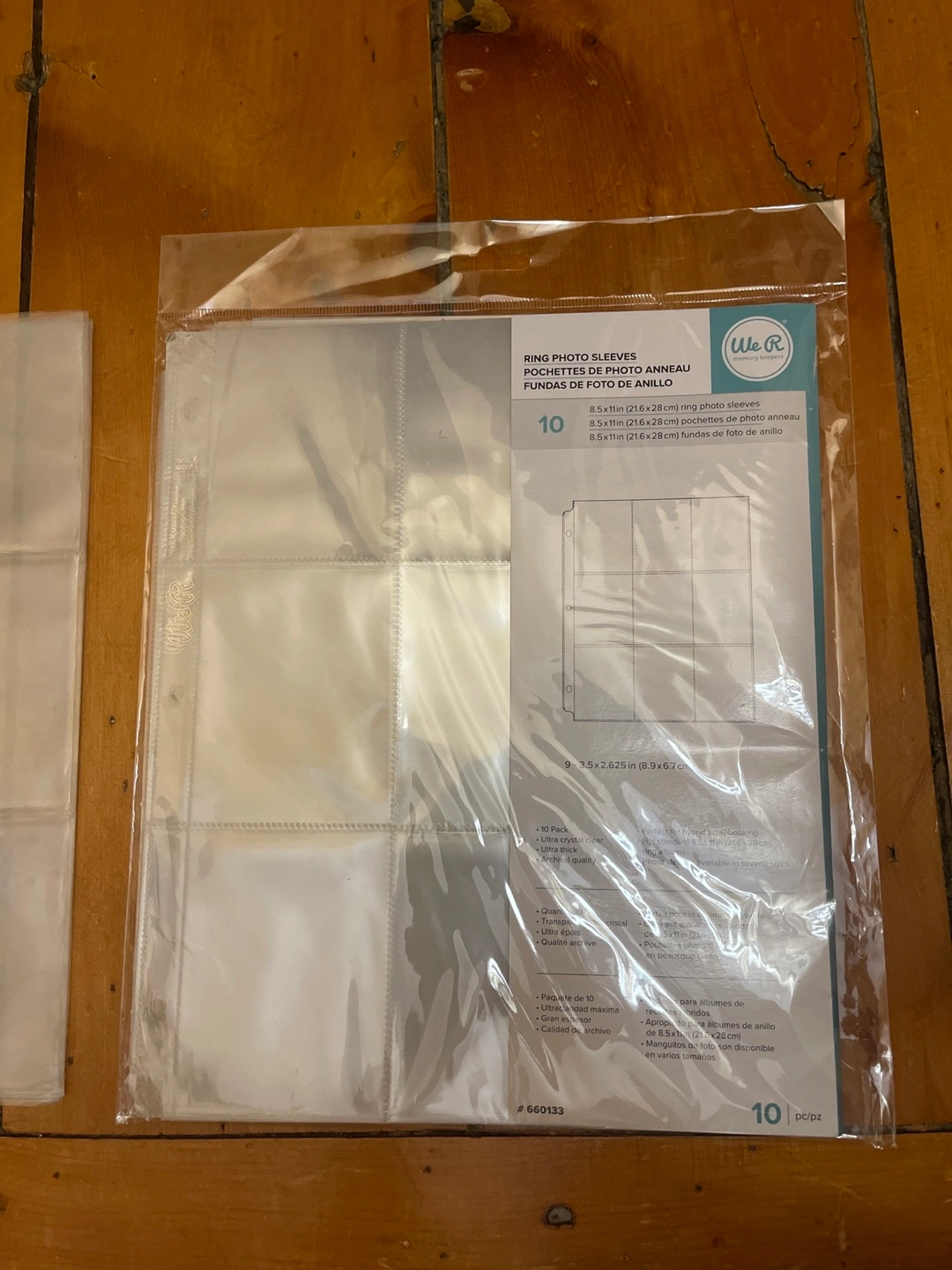10-pack of clear plastic ring photo sleeves. Great for organizing photos or memorabilia. Acid-free. 8.5 x 11 inch. I will include the 4 used pages seen on 2nd photo.