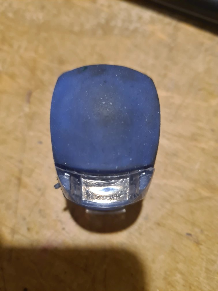 Small, blue bike light. Scratches and scuffs visible. Clear lens.