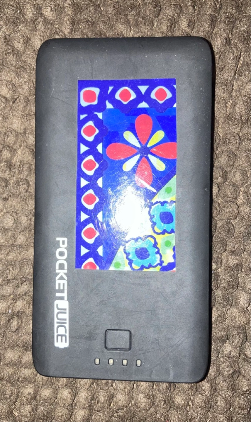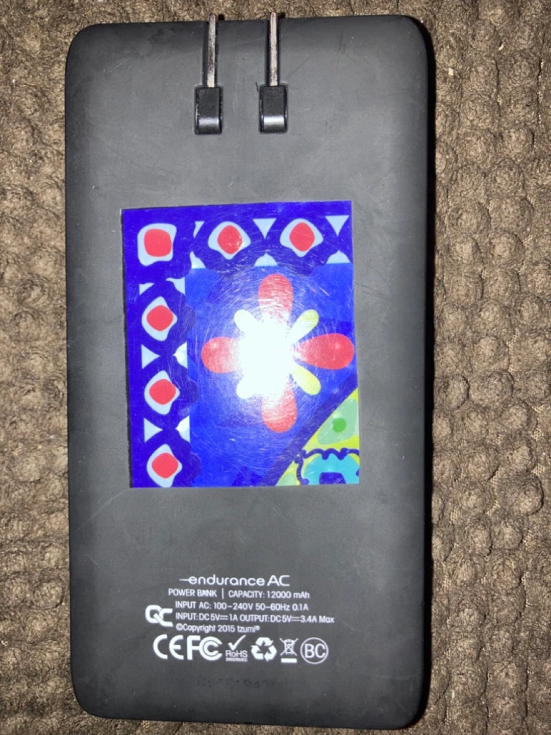 Portable power bank. 12000 mAh capacity. Features colourful design. Includes AC plug.