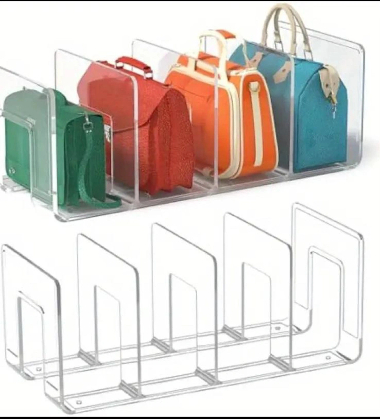 Brand new Each $10 Clear acrylic handbag organizer. Holds multiple handbags. Stackable design. Perfect for closets or shelves.