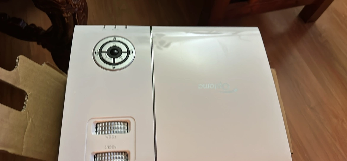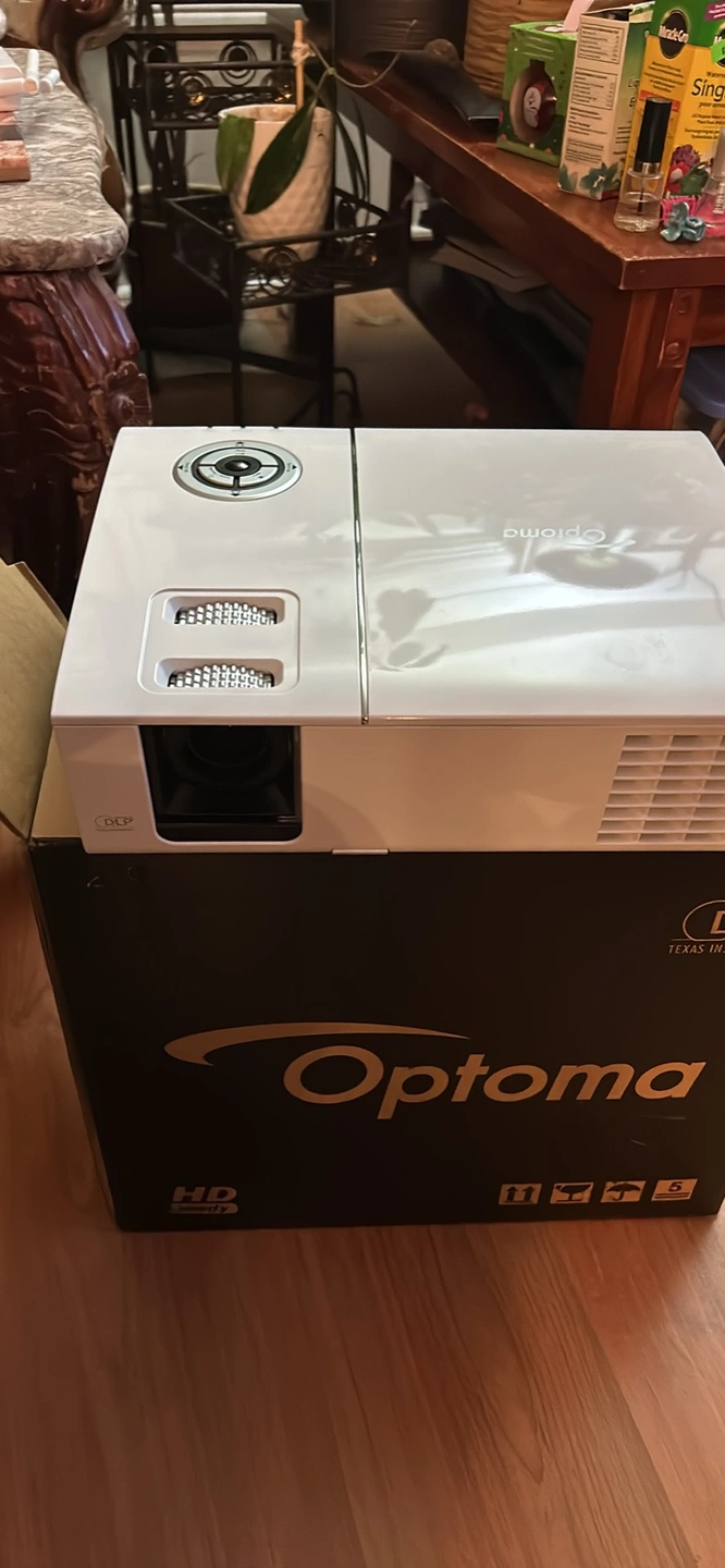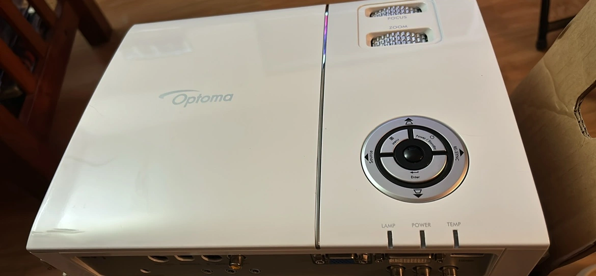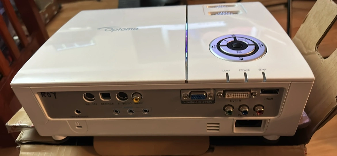 White Optoma HD projector. Multiple ports, including HDMI. Good condition, minor cosmetic damage.
