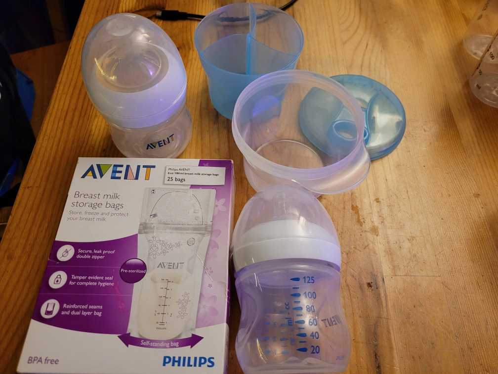 Two AVENT baby bottles, 125ml capacity. Box pre-sterilized AVENT breast milk storage bags. BPA free. Self-standing bags. Secure, leak-proof double zipper. All products by Phillips avent Two 125 ml milk bottles One was used, one is new $10 snack container, 3 compartments And breast milk storage pouches, 20 left $5