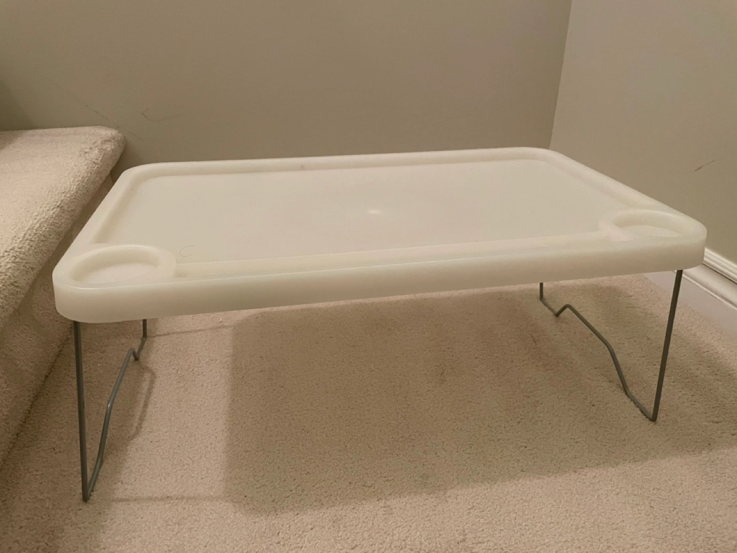 Portable folding tray table. Features a flat surface and two cup holders. Grey metal legs.