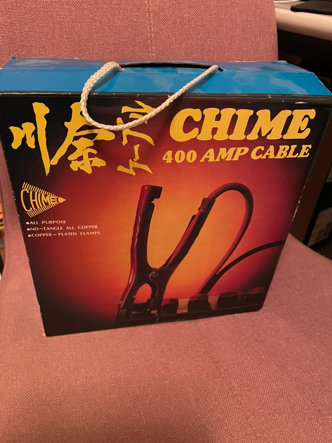 CHIME 400 amp jumper cables. Multi-stranded copper for high conductivity. Suitable for commercial vehicles and plants. 6, 12 or 24V use. Heavy flexible insulation. Copper-plated clamps. No-tangle design.