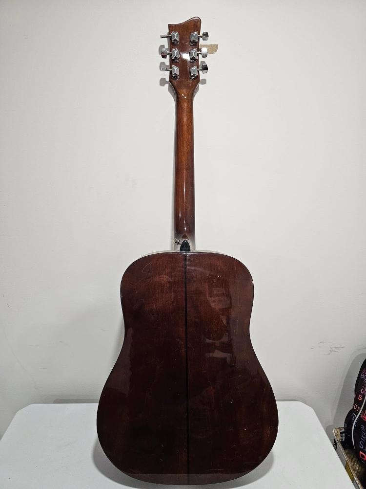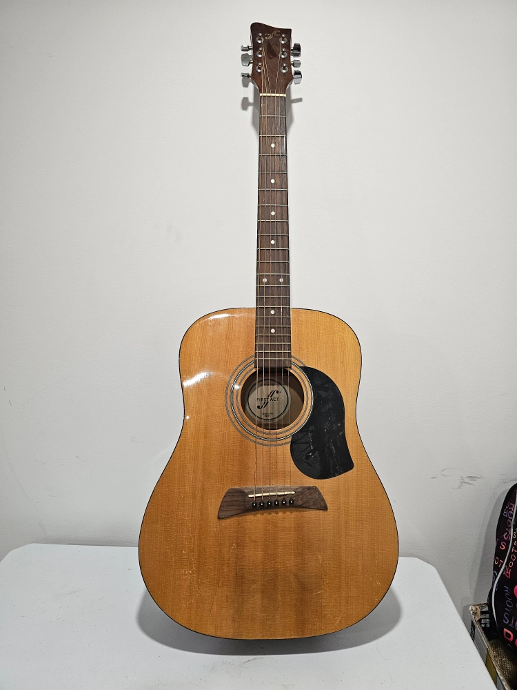 Acoustic guitar, six strings. Natural wood finish. Some wear and tear. Good for beginners or collectors.