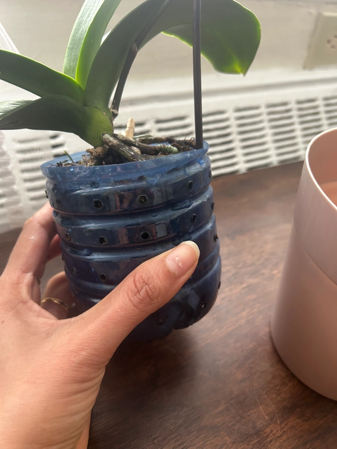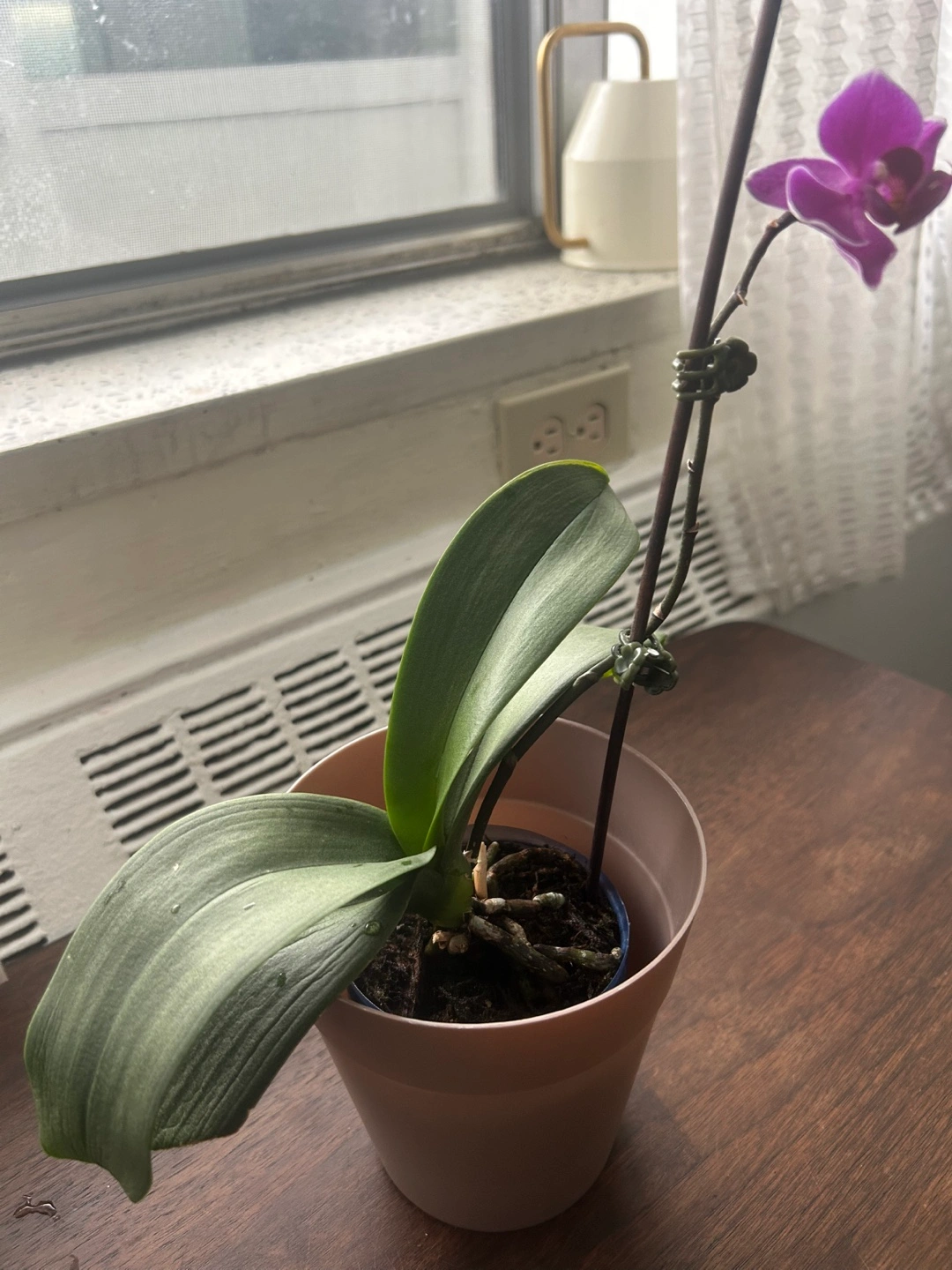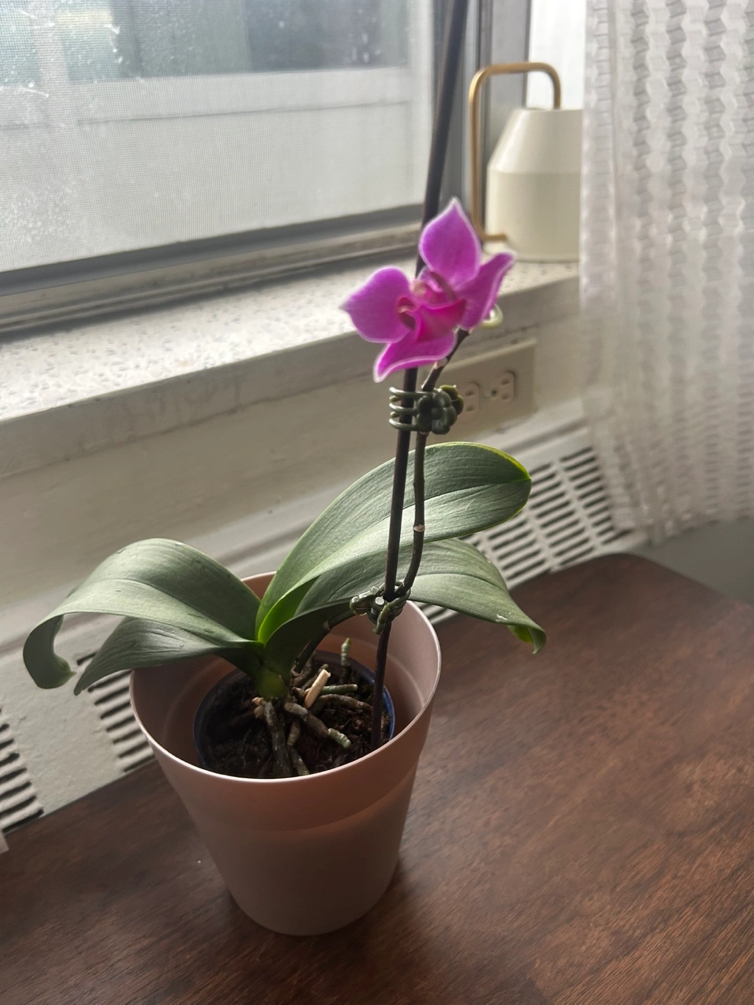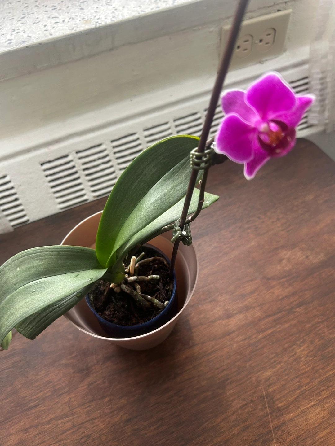 Beautiful purple Phalaenopsis orchid. One bloom currently. Potted in a plastic pot. Healthy roots visible. Placed in a well draining container. Needs a loving home. Pet free and smoke free home We are moving to our home country that’s why I am selling it.