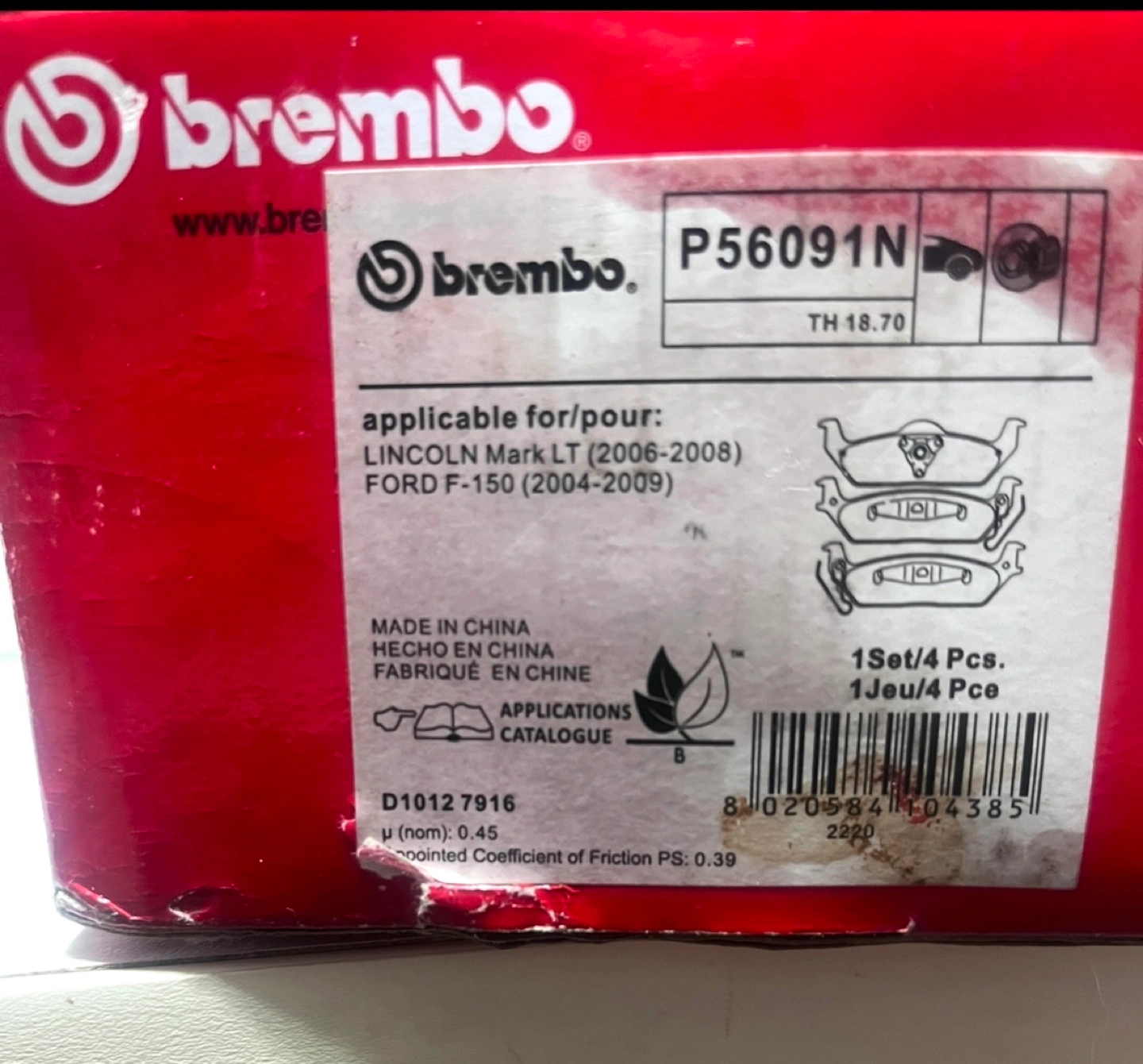Brand new in box Brembo brake pads. Premium ceramic. Fits Lincoln Mark LT (2006-2008) and Ford F-150 (2004-2009). Set of four pads. Made in China.