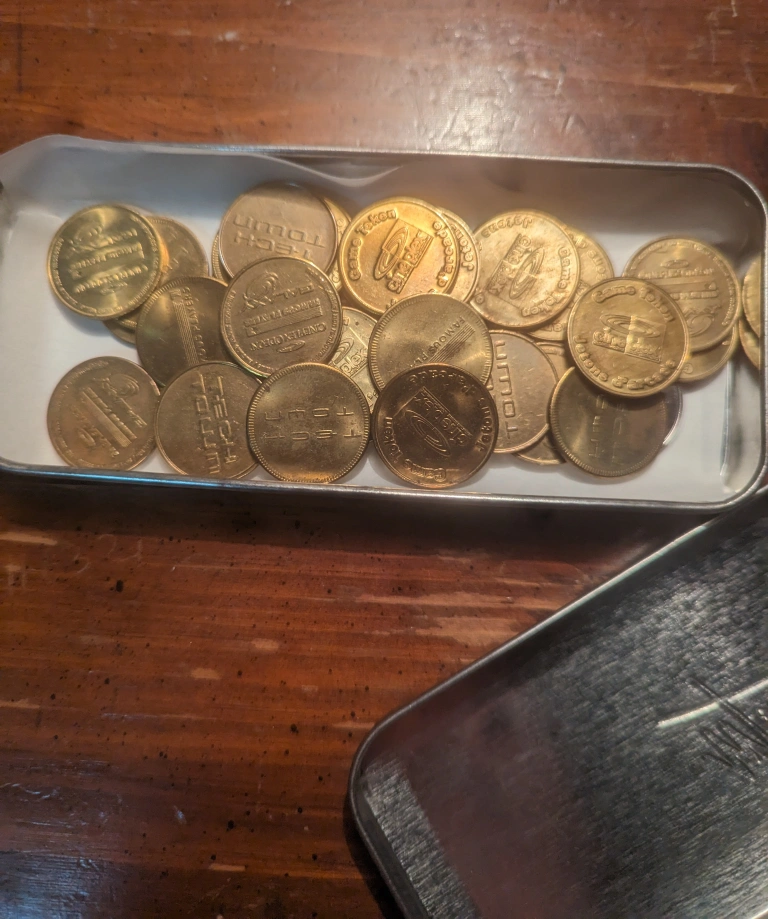 Collection of27 pieces off Cineplex Famous Players vintage metal tokens. From the arcade : Xscape. With metal carrying tin. Can be still used if you find an old Xscape arcade or collector items.