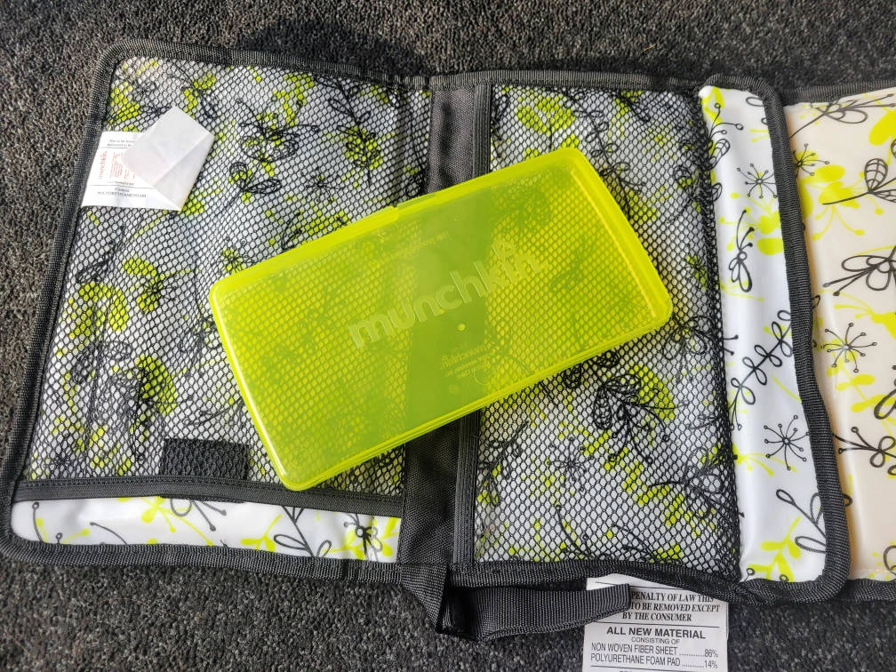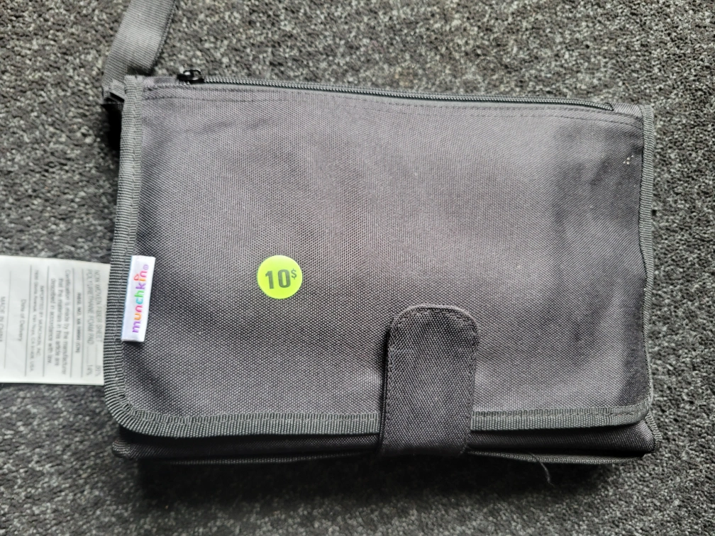 Portable changing mat, folds into nice pouch. Includes a small, lime green supplies container. Various pockets for diapers, wipes, cream etc. Ensures comfort and cleanliness. It's a real lifesaver when you are out and about, assuring that the space you put your baby on is clean and sanitary. Soft pad for the head end easy clean sanitary pad extension. check Amazon for more description and video. https://www.amazon.ca/Munchkin-11508-Designer-Diaper-Change/dp/B0035ER592/ref=mp_s_a_1_4?dib=eyJ2IjoiMSJ9.ZPI3EyGAYNMSBcIFc7yI7qKOgGnsCfHnQ-P_mvYEsKadhQPztZ9vb5ar07tUe5DZ-P7bzZNh5epvQnB0JtBYMA.l0AZDnJ3zeNXyR4khjvxkaJyXgzHn9wBpI9Se6SKCZo&dib_tag=se&qid=1741118319&refinements=p_89%3AMunchkin&s=baby&sr=1-4