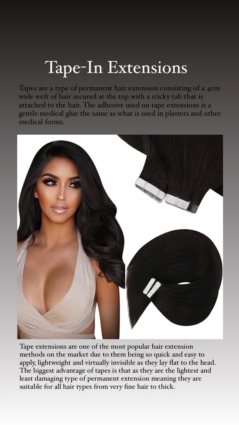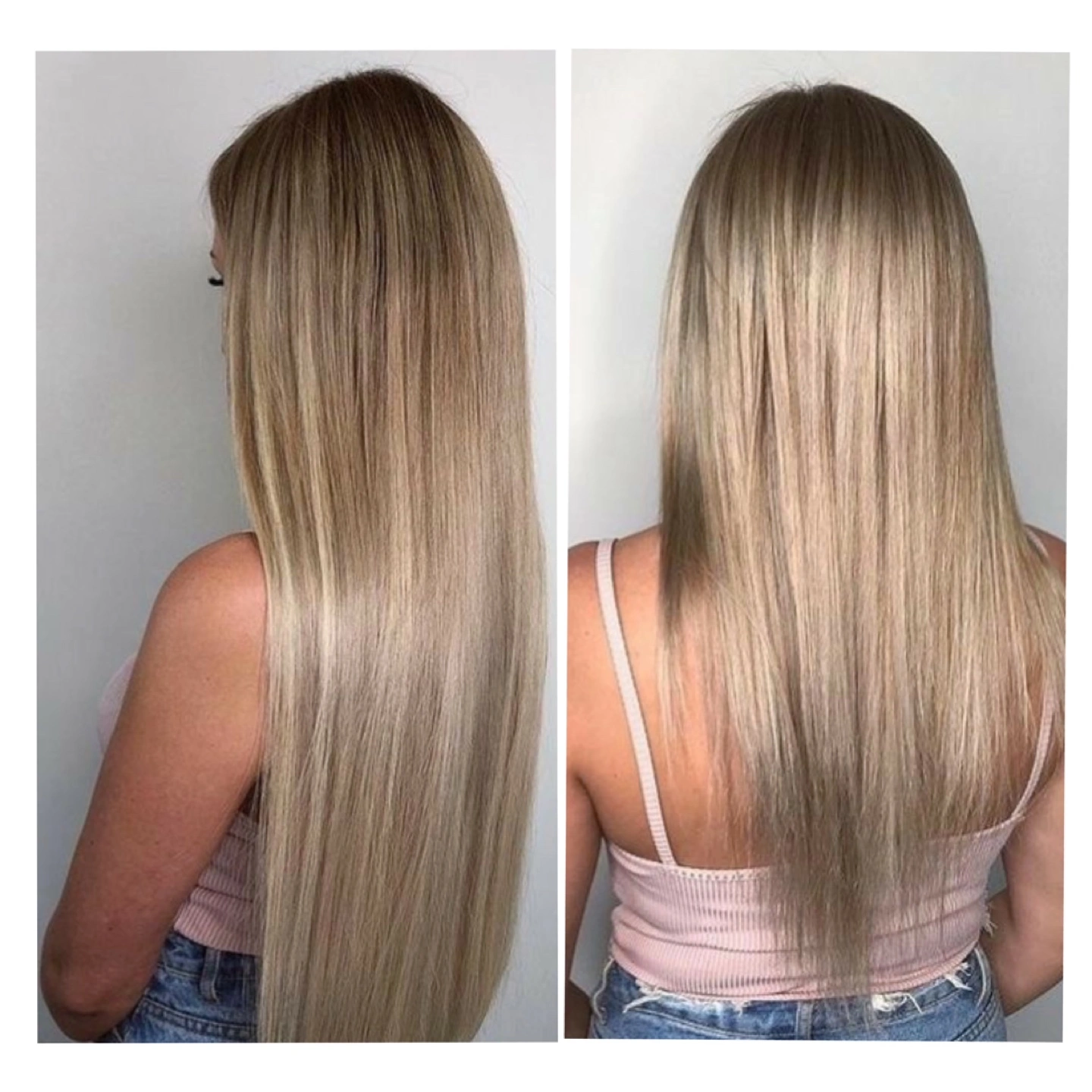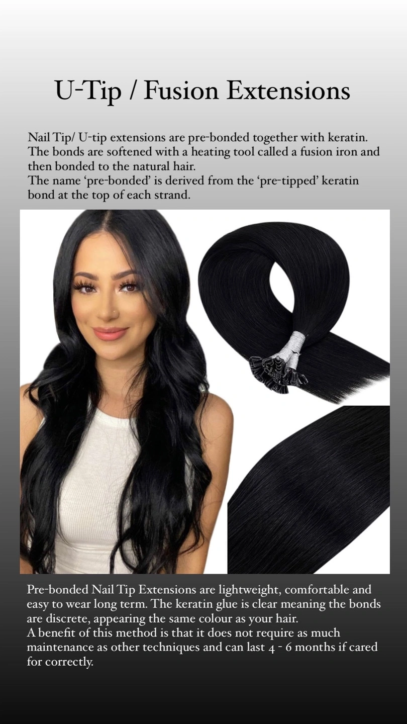 Pre-bonded keratin U-tip and fusion hair extensions. Lightweight and comfortable. Easy to wear long term. Also included are tape-in extensions, a popular method; quick and easy to apply. The lightest and least damaging. Microlinks are another option; ideal for fine to medium density hair. Blends well. Various colours available.