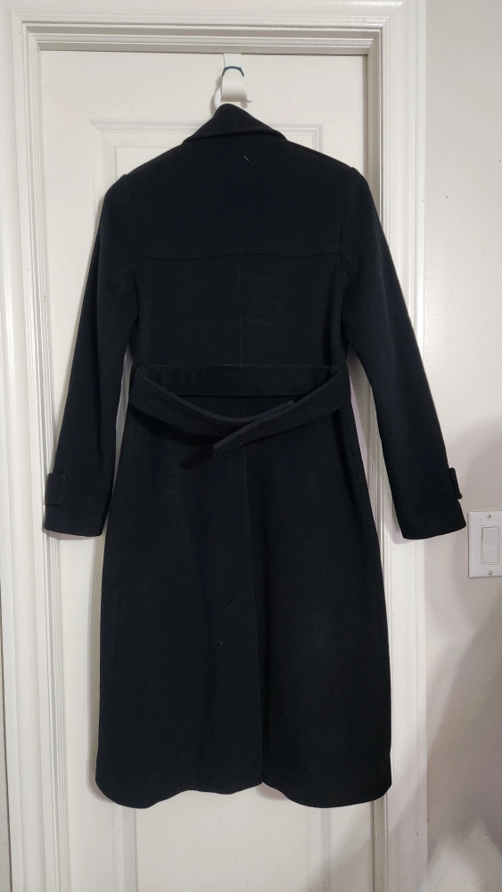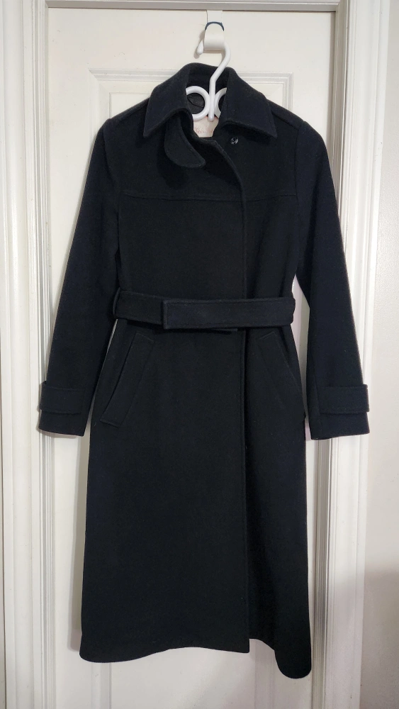 Classic black coat. Features a belted waist, notched collar, and long sleeves. Pockets at the front. Fully lined.