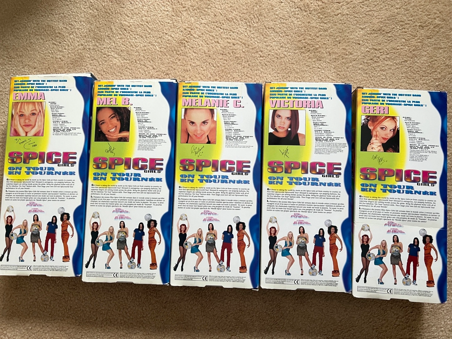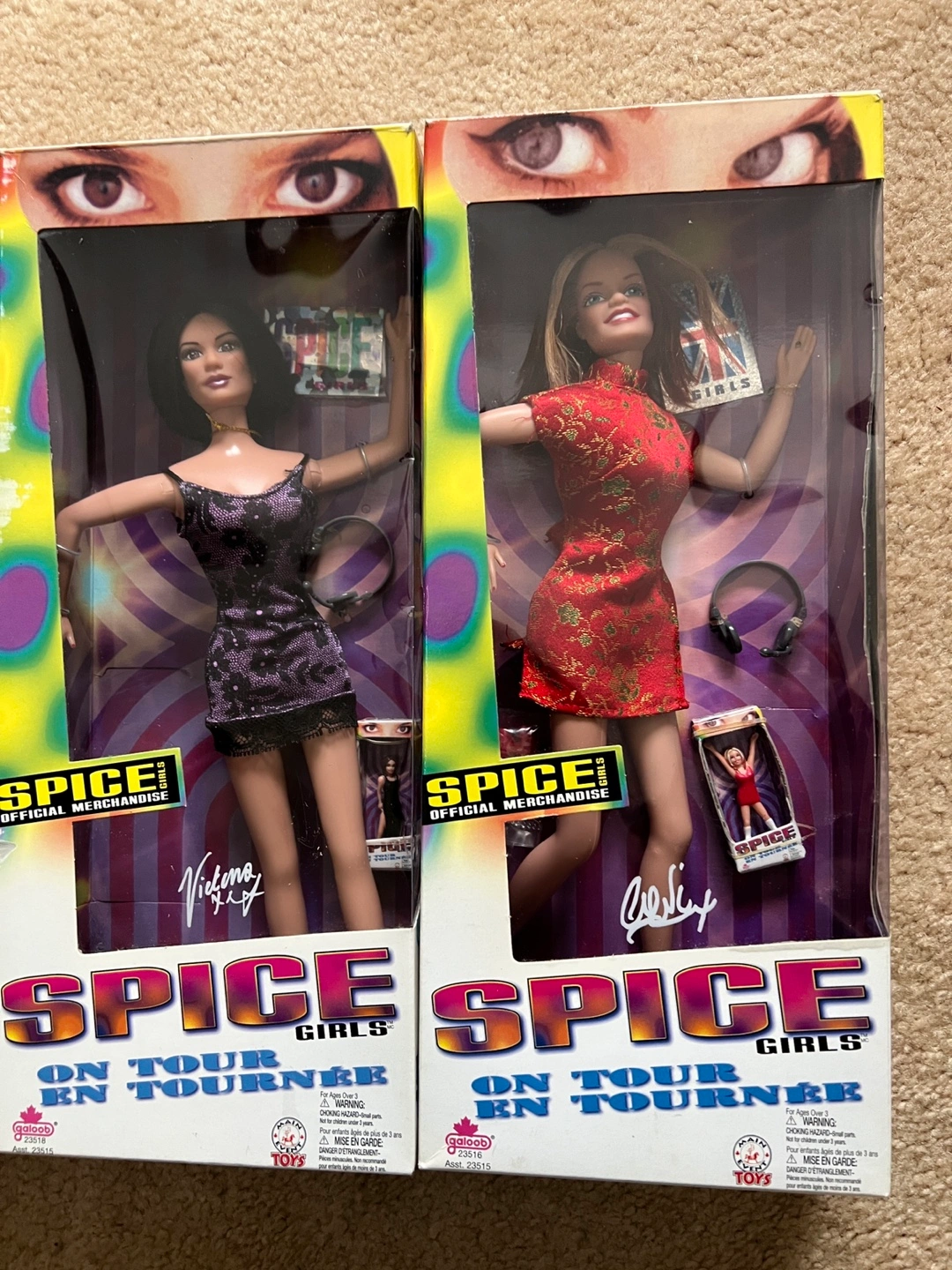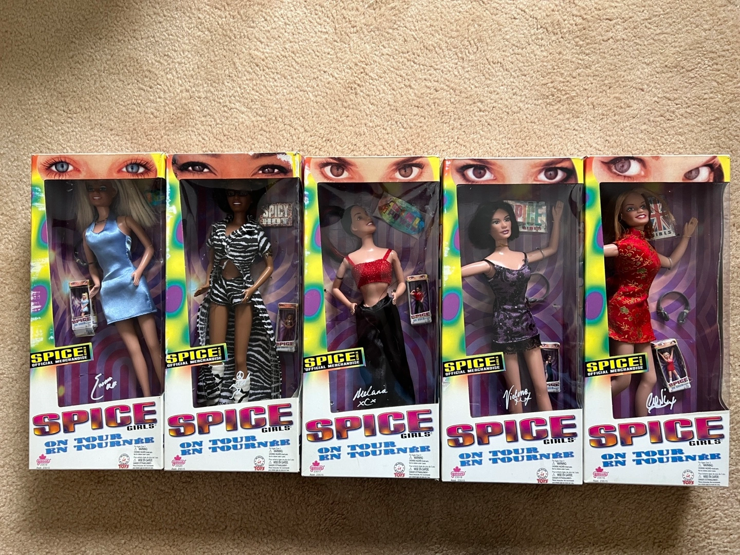 Complete set of five Spice Girls dolls from their "On Tour" collection. Each doll in original box. Collectible dolls, great for fans. Spice girl Dolls 1998 Galoob On Tour Collection Collection includes, Baby Spice (Emma) Scary Spice (Mel B) Sporty Spice (Mel C) Posh Spice (Victoria) Ginger Spice (Geri) Including the accessories Opened boxes but still in good condition Smoke free home Pick up near Glenanna Road and Hwy 2 Shipping at buyers expense If ad is still up it’s available